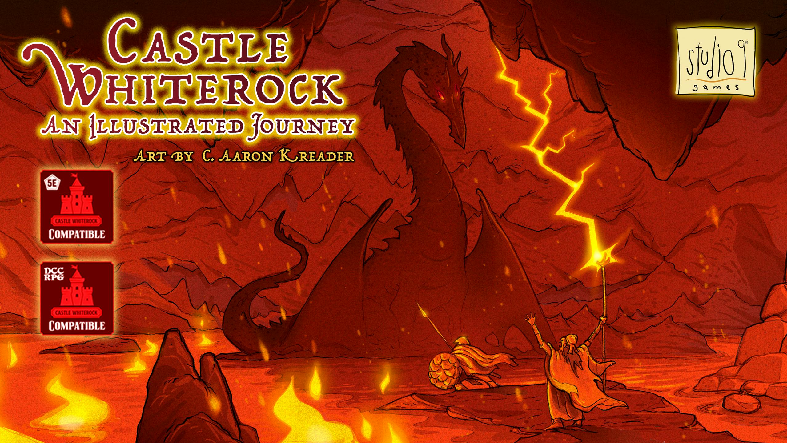 Castle Whiterock is "a classic castle-themed mega-dungeon. This huge boxed set holds books, poster maps, and more than 700 pages of adventure content. The challenges herein can fuel a campaign for years. The 5E boxed set takes 5E characters from 1st through 15th level, and the DCC RPG edition takes DCC RPG characters from 1st through 7th level."