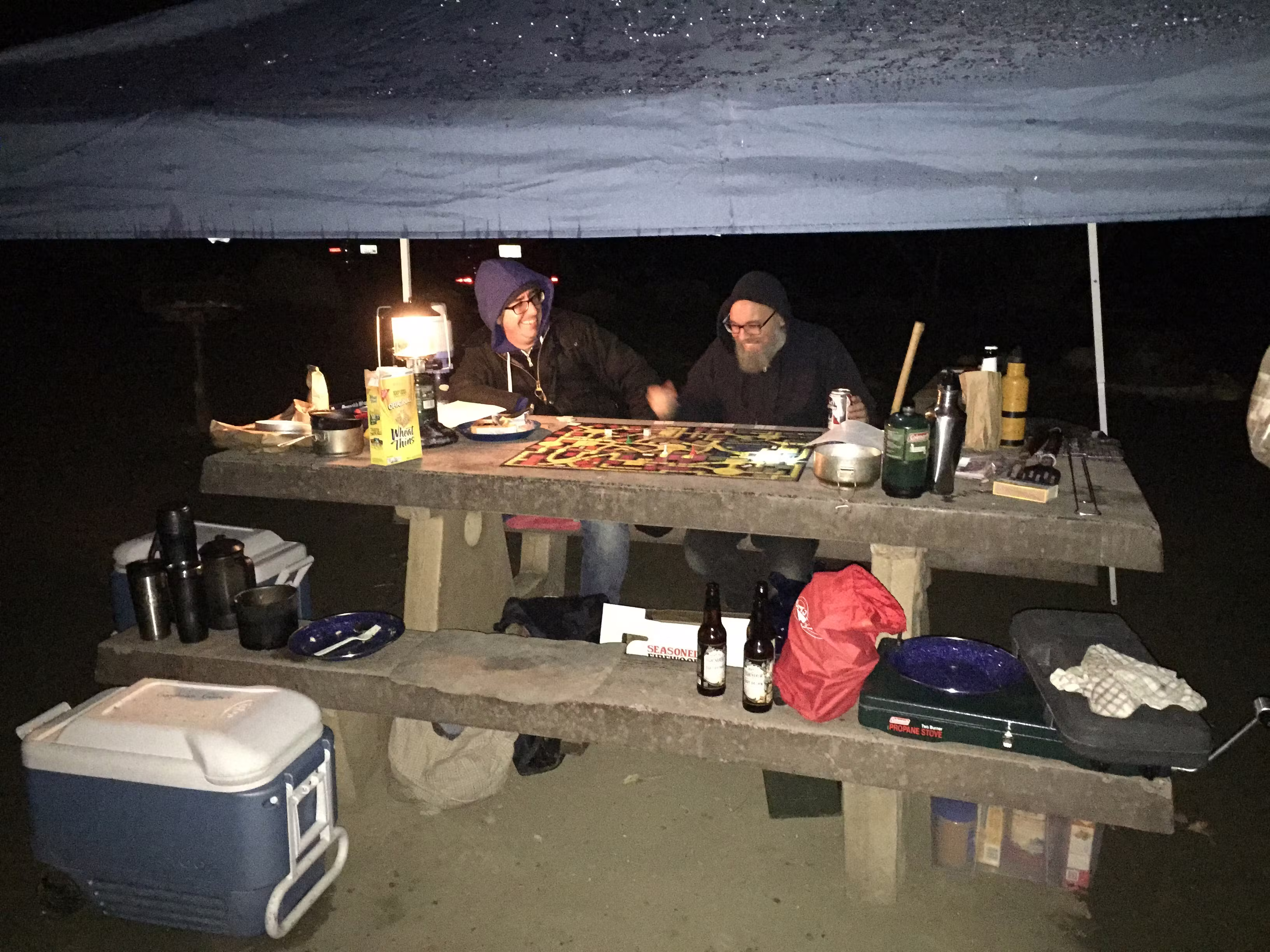 One more photo while we're at it. You know you're a gamer when... your idea of a good time is playing a vintage edition of Dungeon! in the dark in a rainstorm on a cold stone picnic bench in the middle of the woods.