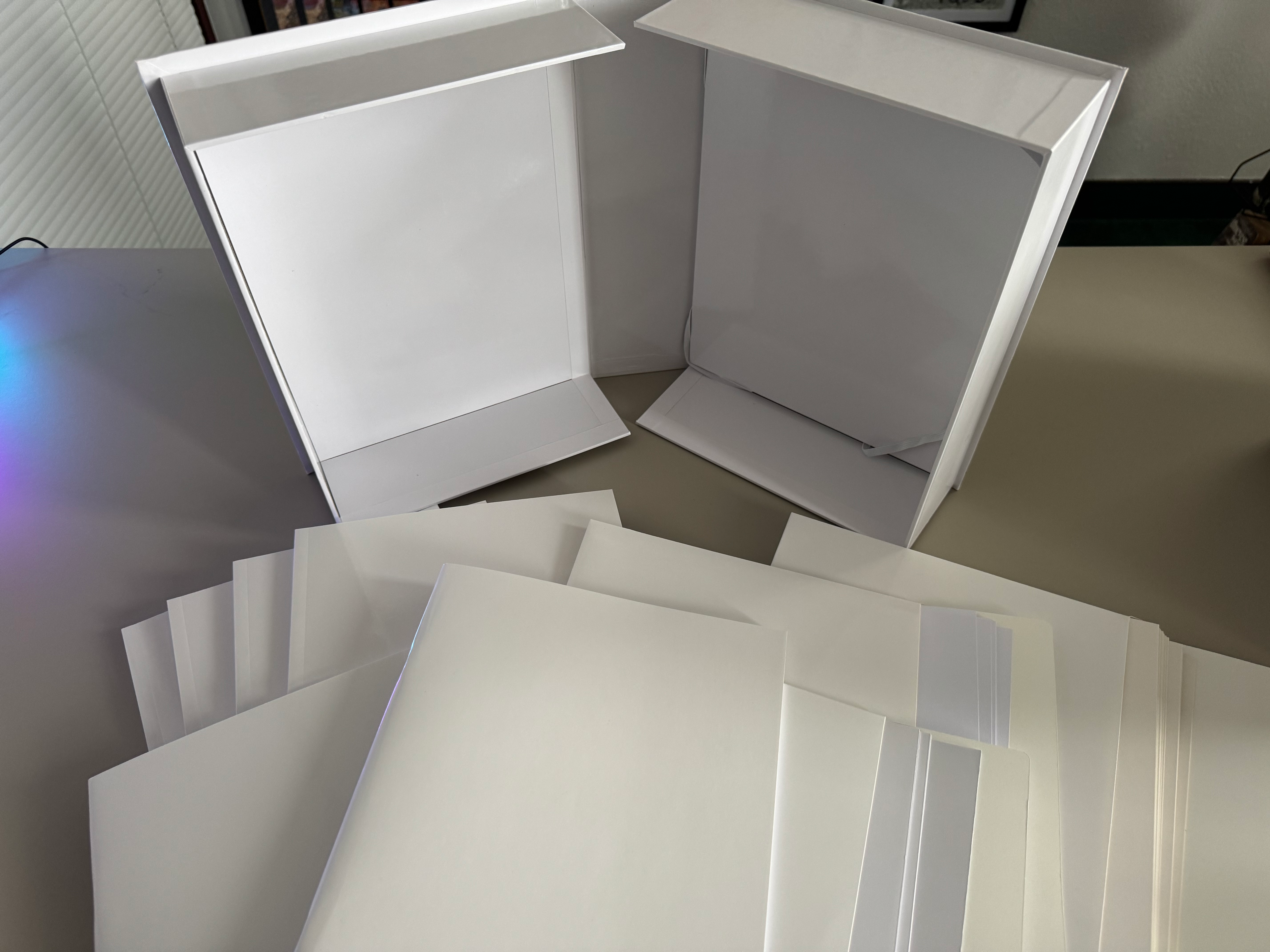 Ever since TSR released the first D&D decades ago, gamers have loved boxed sets. Recently we have been experimenting with this new format for boxed sets. The results are great. Here is a photograph of the clamshell box for a previous project. Note the "hinge" on the spine and the elastic straps on inside cover, plus of course the inside-the-box-top printing: