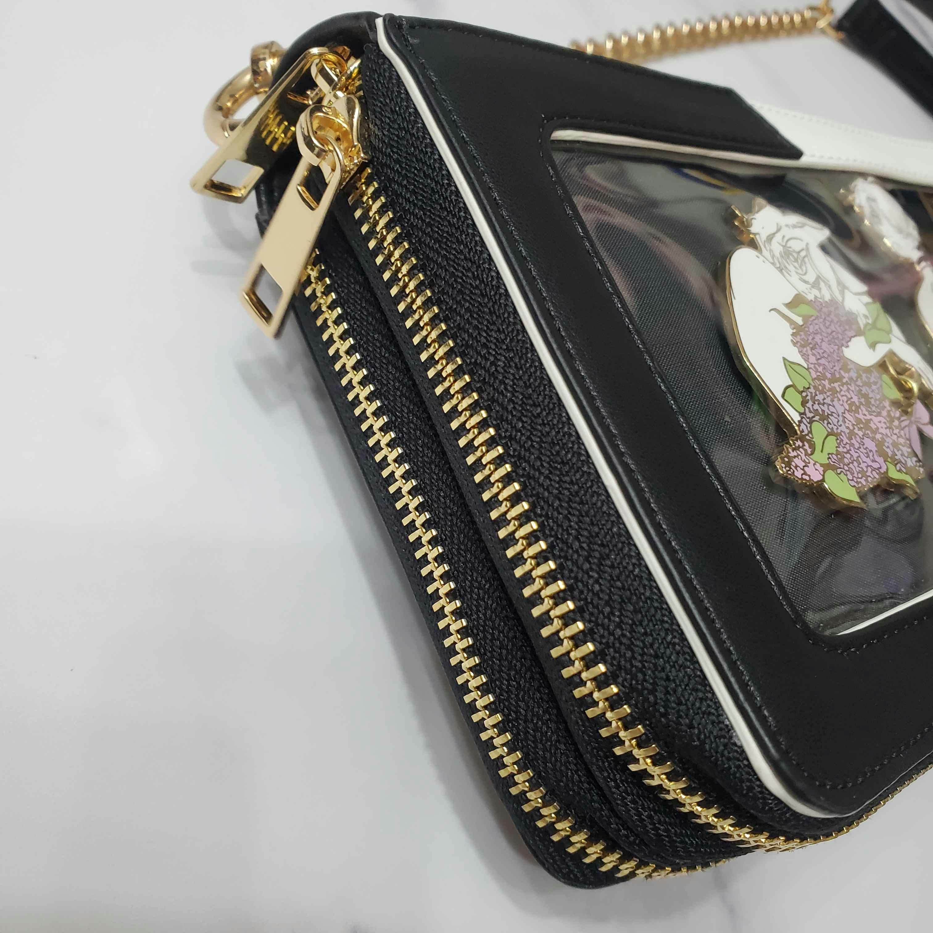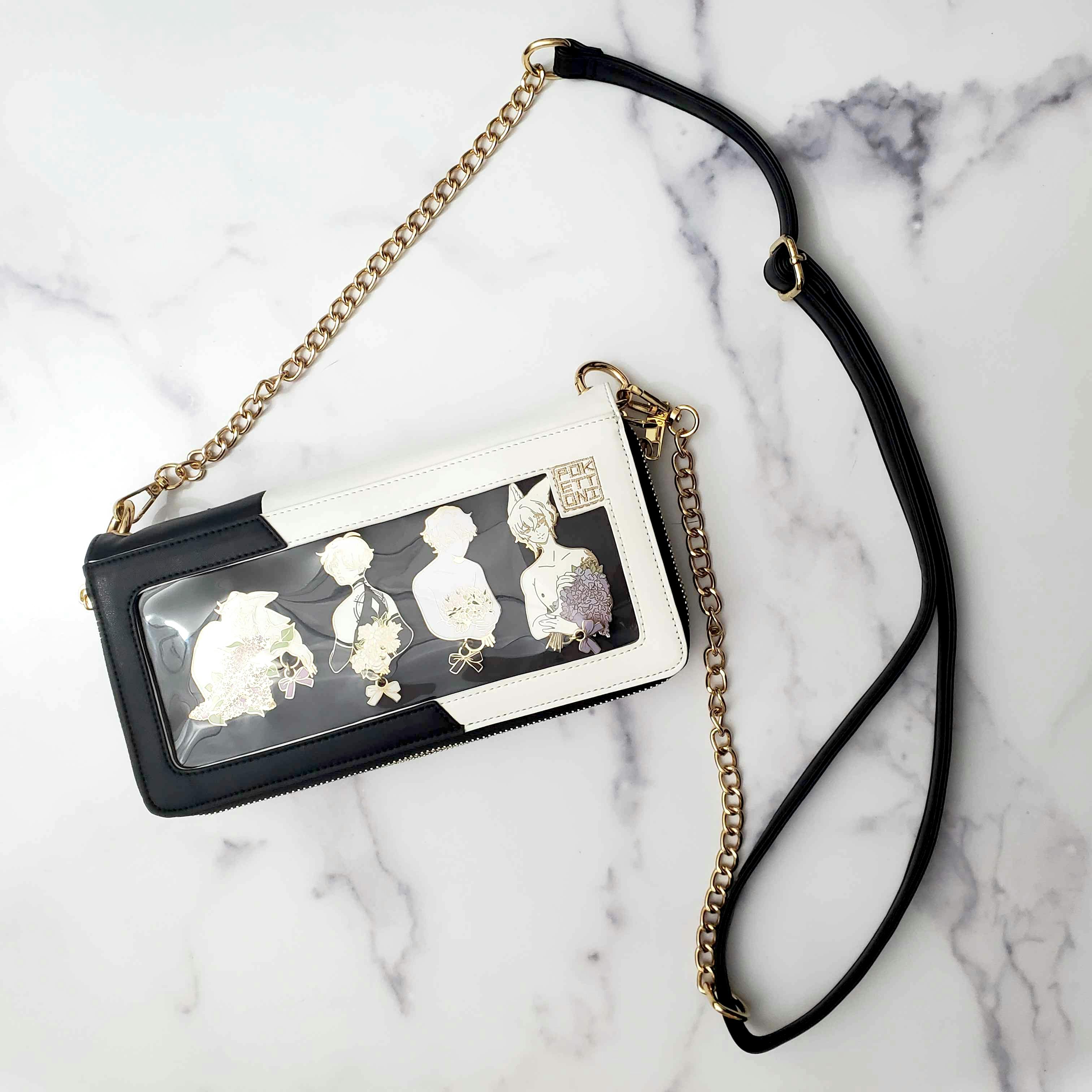 here is the inside of the wallet, the cards slots have been turned to the horizontal position which allows the pins to sit more comfortably in the wallet. i am not sure why they added two id holders ? should i keep it though ? it could be a fun way to display a photo or image of your favorite characters or memories <3