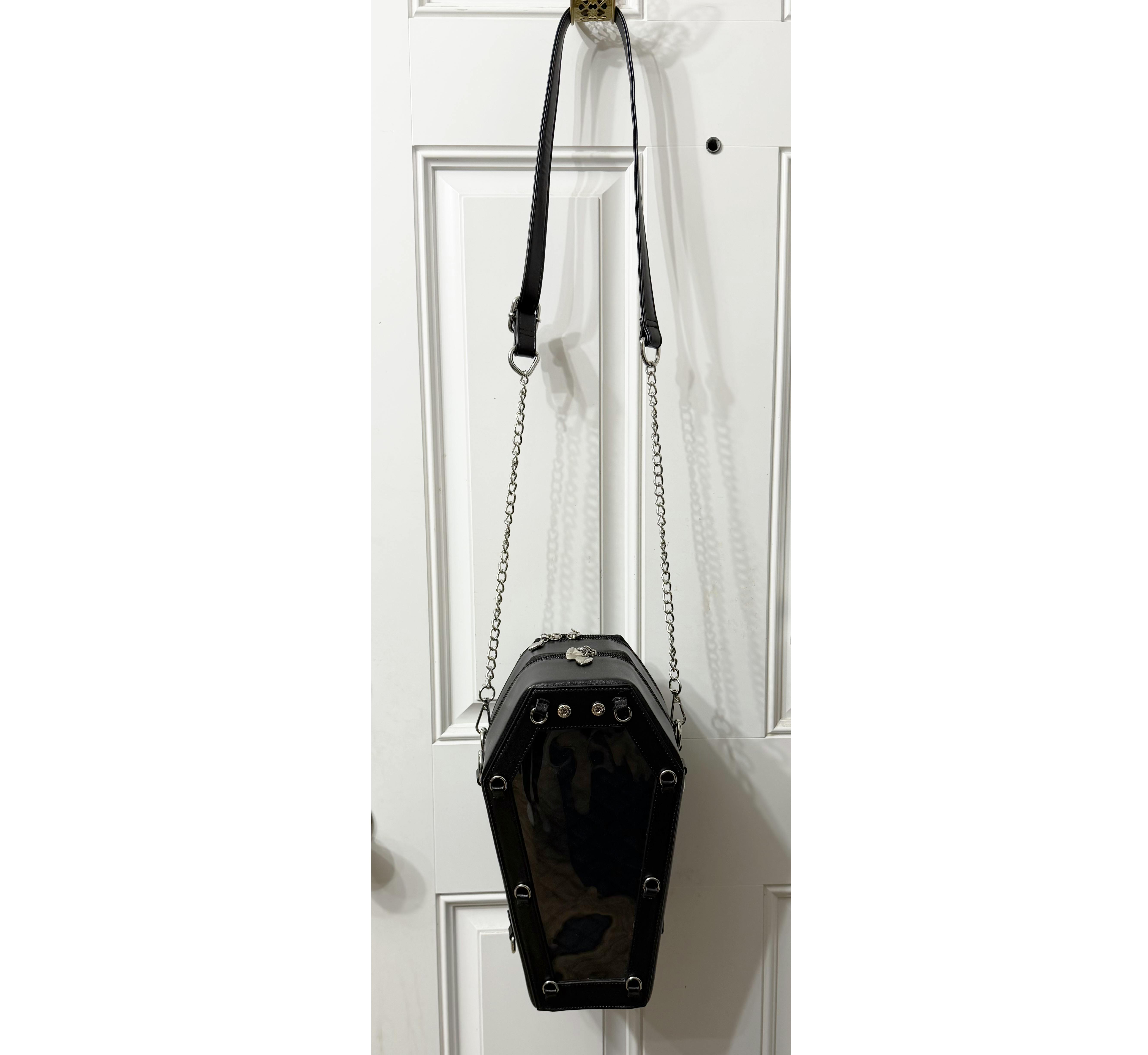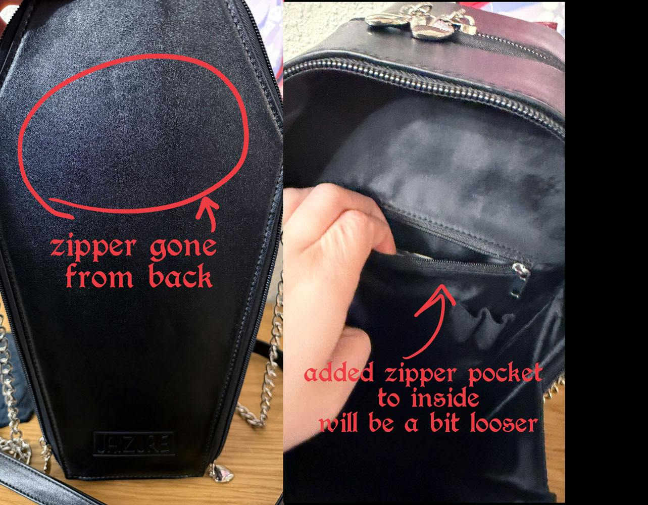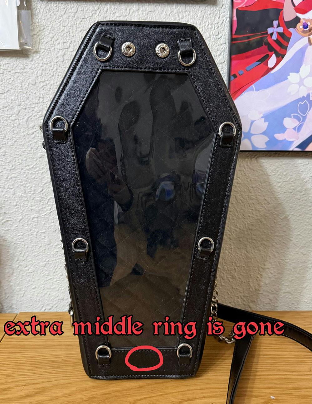 they've also removed the extra link at the bottom and I have a sample of the darker red bow color thats an option on the survey, it's super beautiful on the bag especially in person. I also have a sample of the cushion ita insert ! You can see how it looks in the bag with no pins and theres also a photo of it on its own. Its sooo cute and makes it even more coffin-like i'm very excited to put some pins on it !
