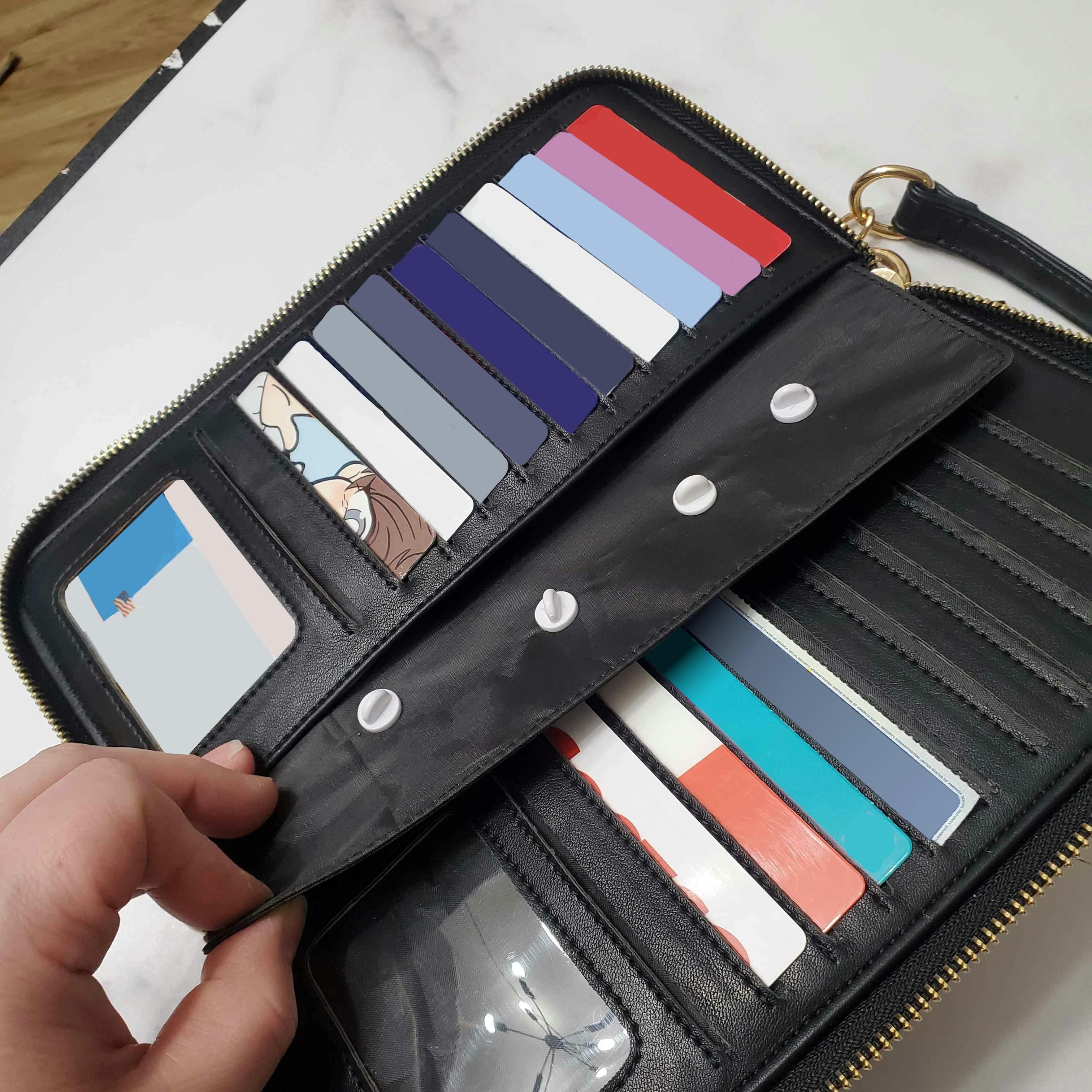 here is a photo of the wallet with the two zippers instead of the previous snaps, while i liked the clean look of the snaps, this helps avoid bulging and keeps everything more secure.