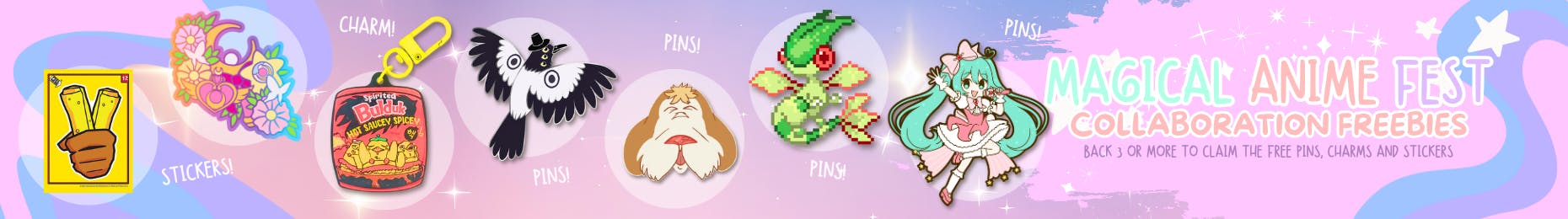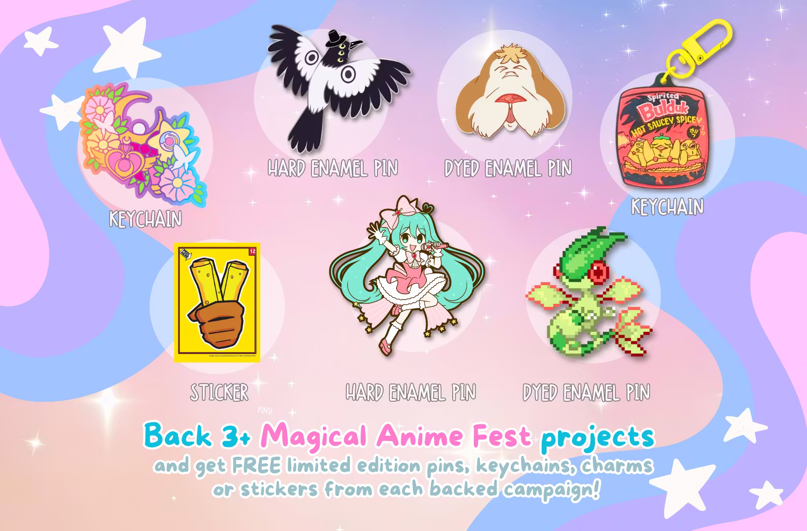 Back 3+ Magical Anime Fest projects and get a FREE limited edition pin, keychain, charm or sticker from each backed campaign.