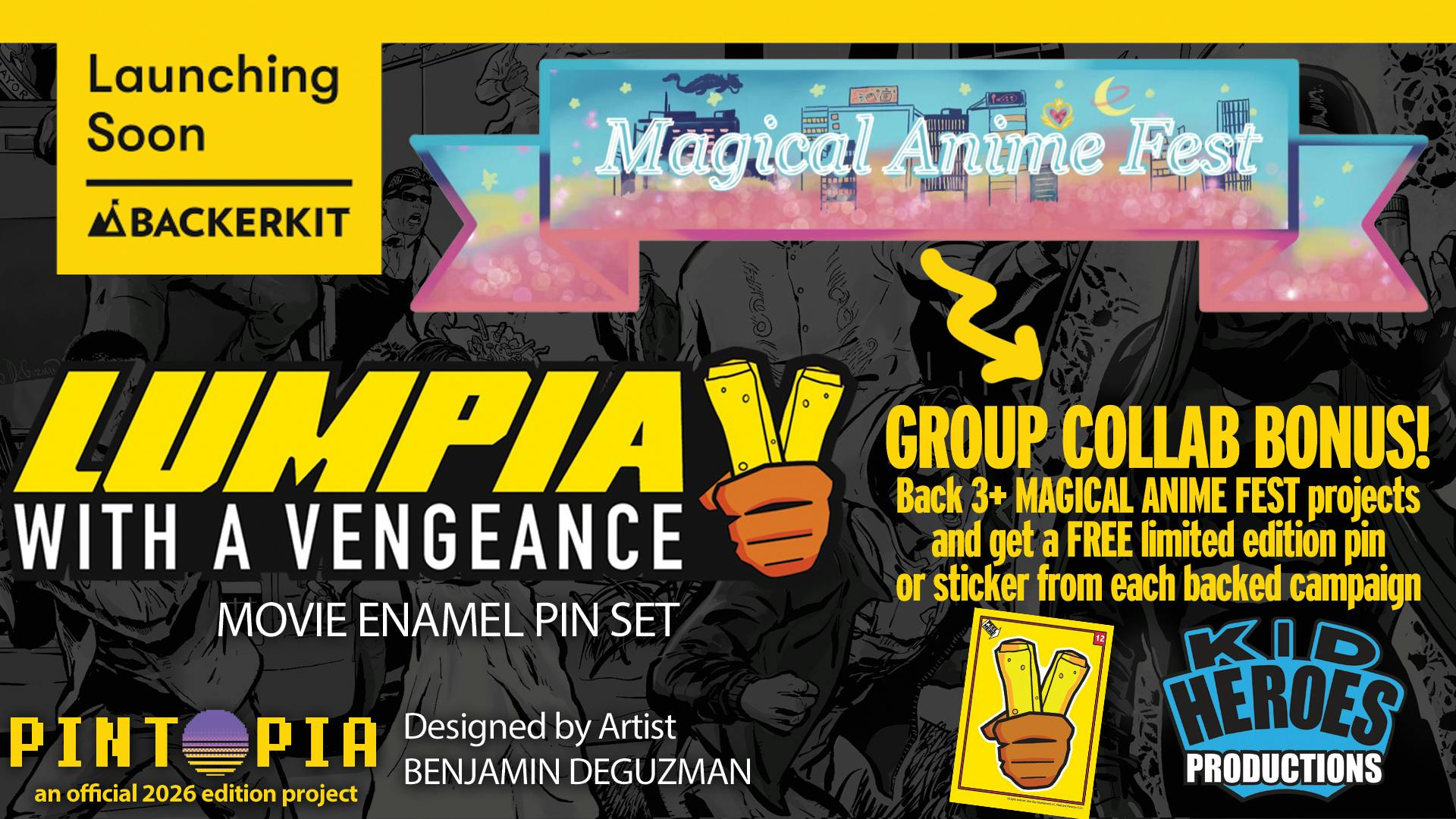 Even more bonus incentives! We are part of the Pintopia group collective - MAGICAL ANIME FEST. Back 3+ of the projects within our group and get a bonus ENAMEL PIN or STICKER from each of the backed campaigns. Our campaign will offer a FREE trading card STICKER with the LUMPIA WITH A VENGEANCE logo.