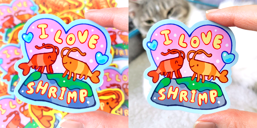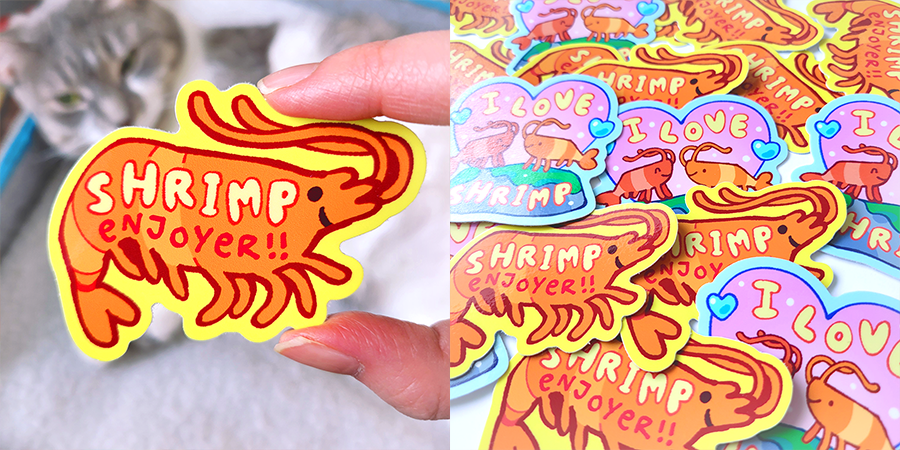 Just wanted to share some fun photos of the campaign stickers! They are so cute and I love how vibrant-ly yellow the Shrimp Enjoyer sticker is! :)
