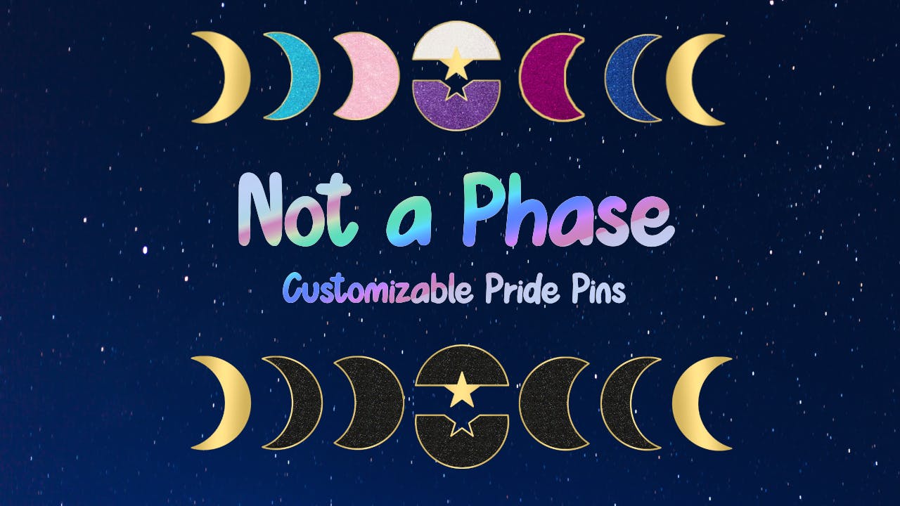 Next month I'm launching Not a Phase | Lunar Pride Pins These pins are sold in sets and are completely customizable. They're available in solid colors, or the design can hold up to two pride flags distributed throughout the phases of the moon. I'm going to have an extremely limited supply available after the campaign, so if you're looking for some subtle pride options (or just really nifty moon pins), make sure you follow the prelaunch page below.