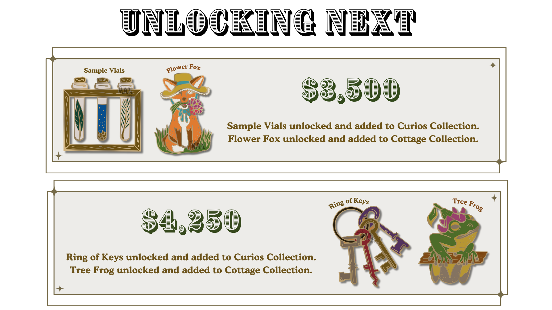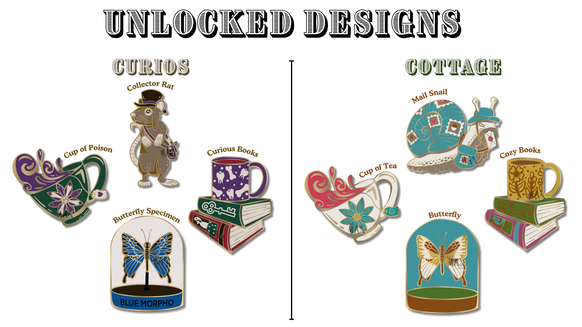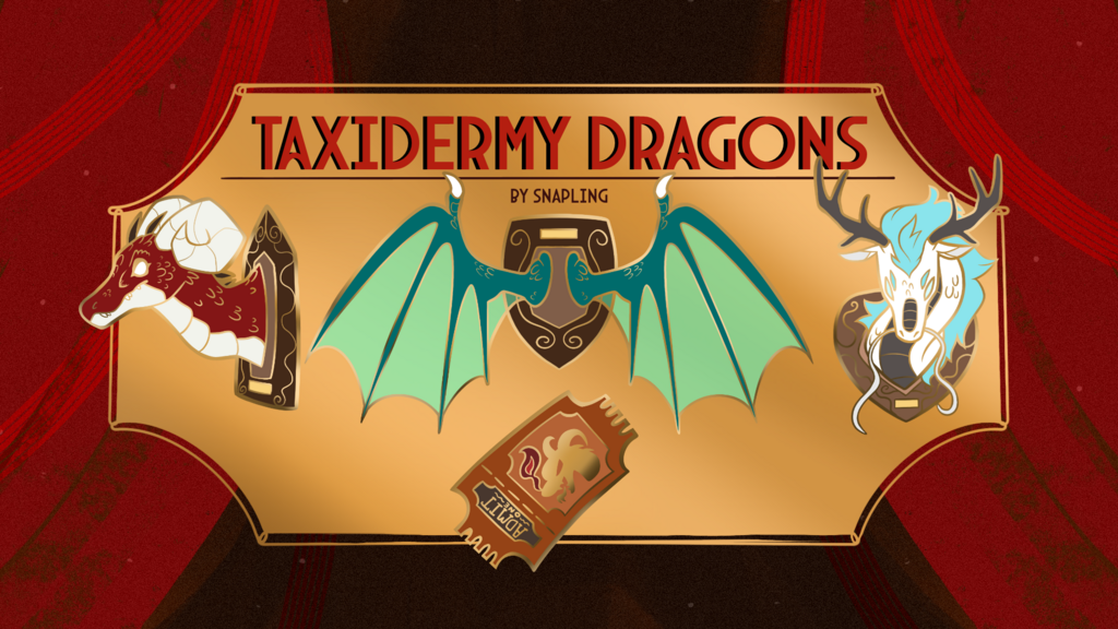 I am so happy to announce that the first two goals have already been met- this means that the River Dragon Mounted Heads, Butterfly Dragon Wing Display, Wet Specimen Oddity, AND the Ram Dragon Mounted Heads are all unlocked!!! This also includes all color variants for those pin designs!