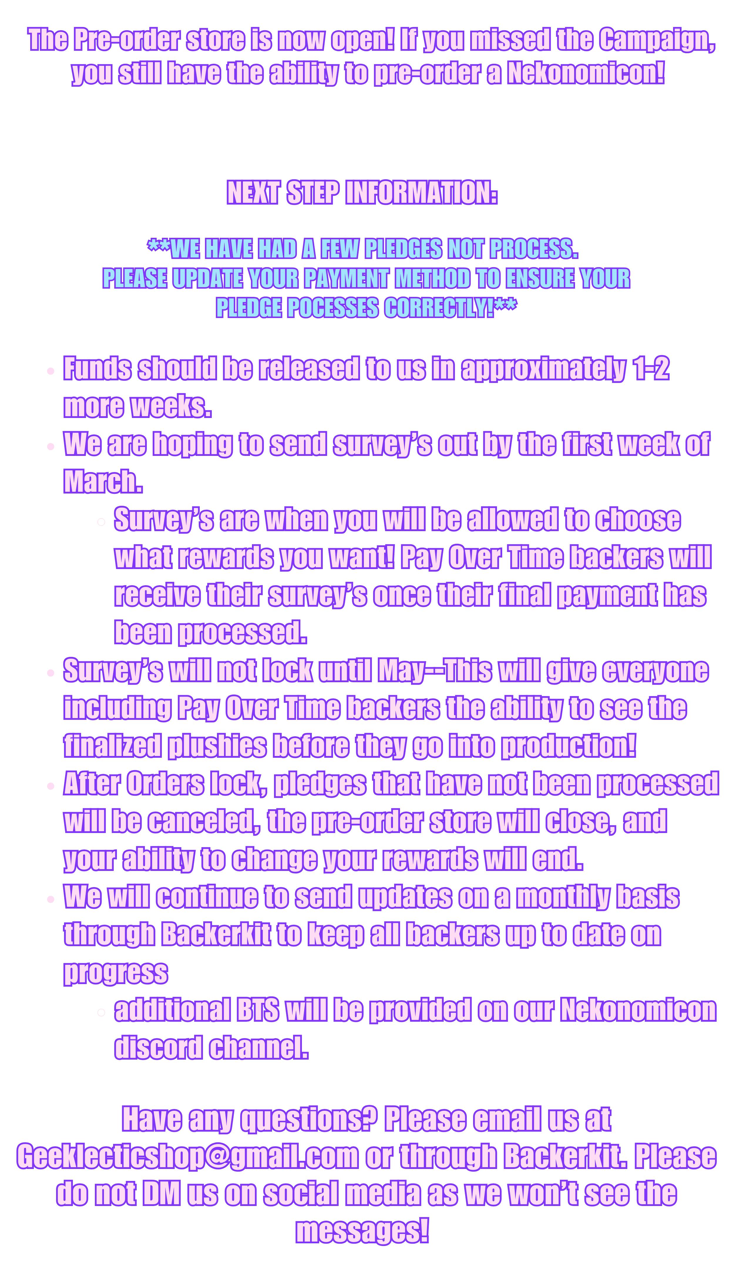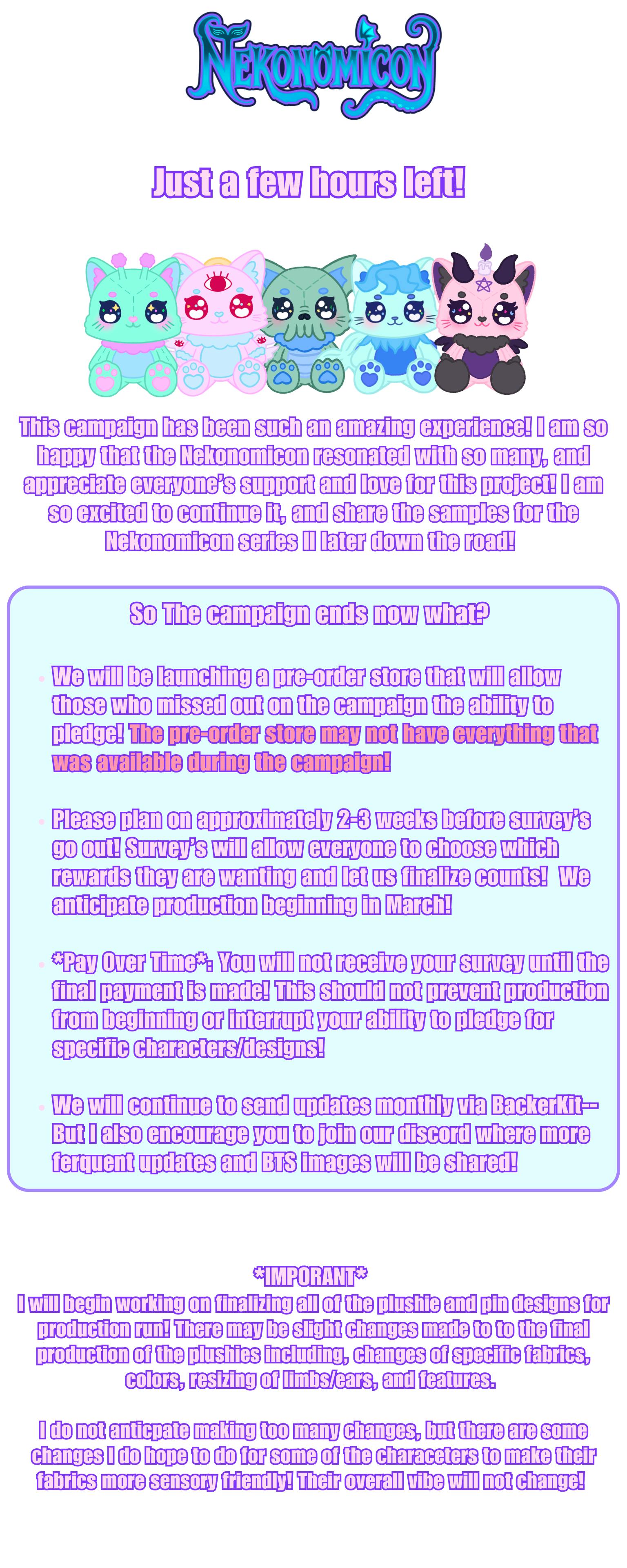 FOR PAY OVER TIME BACKERS ONLY: if you selected pay over time, I will not be able to send you a survey until your payments have completed in a few months. Because of this, I need everyone who chose Pay Over Time to please fill out this google form so I know what counts I need to order: https://forms.gle/WdyncXzJ8v6A9qx78