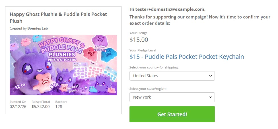 Step 1 - You will first see the pledge level you purchased. On the same page, you will be asked to select your shipping location if BackerKit does not already have it saved.