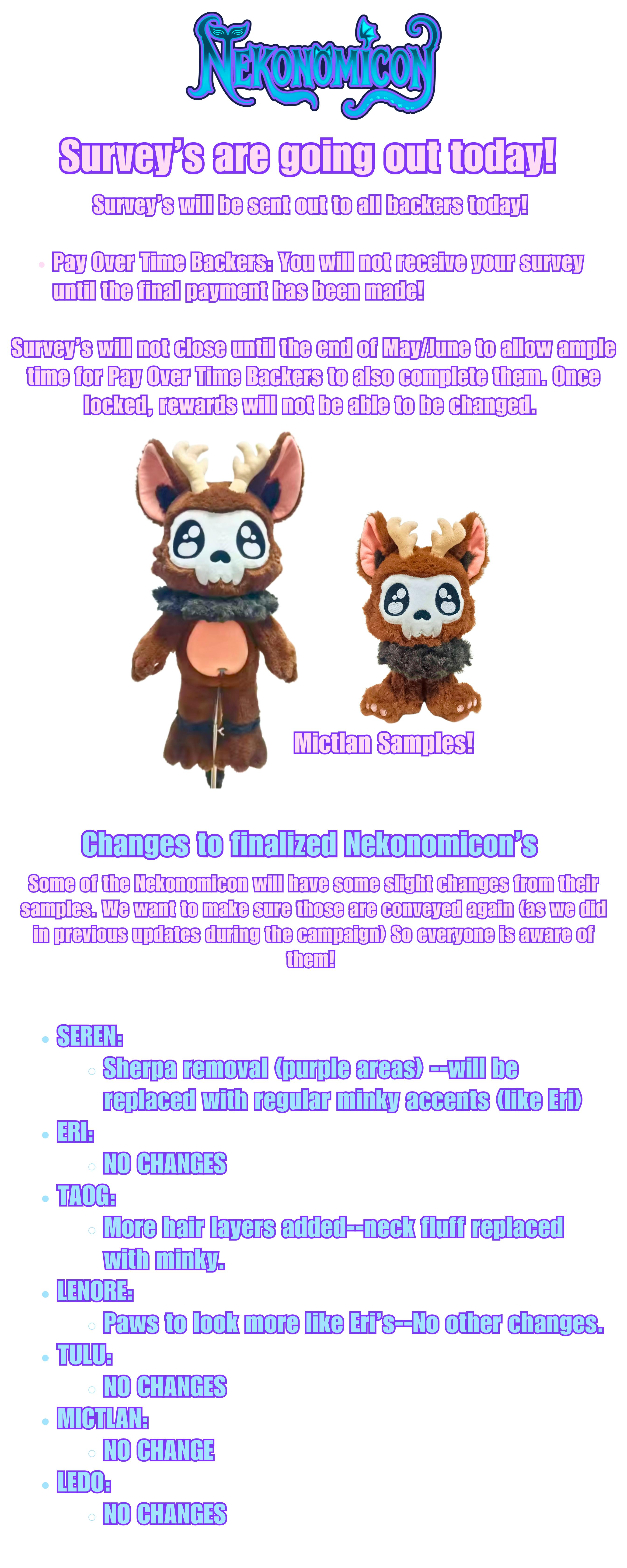 I am reaching out to let you know that surveys will begin to go out this week! First there will be a 'smoke test' that will reach a small percent of backers. This is to make sure everything looks correct before it goes out to the majority of backers! If all goes well, all surveys should go out this week. Completing them as soon as possible is ideal so that I can put in the order for the pins!