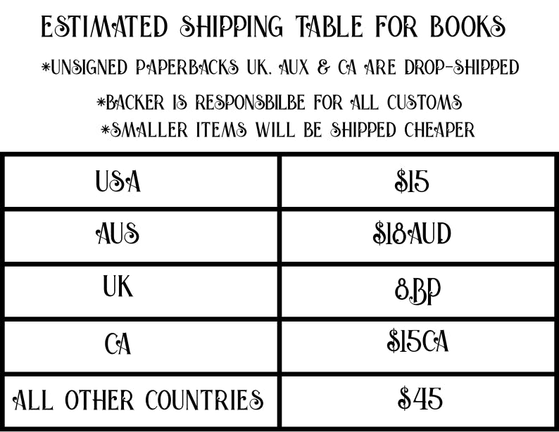 SHIPPING WILL BE COLLECTED AFTER FUNDING. PRICES IN REWARD TIERS DO NOT INCLUDE SHIPPING. Drop shipping unsigned paperbacks to CA, UK, and AUS. (Estimates AU$18 for drop shipping. CA is about CA$15 for drop shipping. UK is about 8BP)