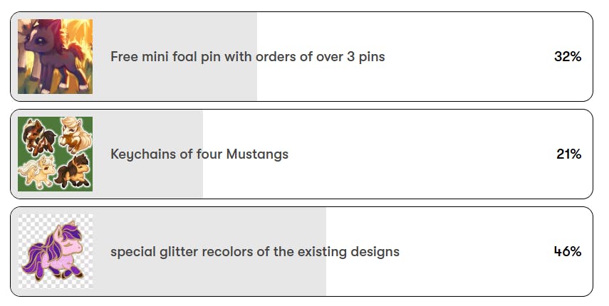 The mustang pin total dropped a little since I last mentioned it, but the total is now 258! I will do a final count after the surveys in case anyone decides to add extra mustang pins ^^ The mini pin freebie will also be added retroactively, so any pins added in the survey as addon will be counted towards your total, and will lead to a free foal pin if the total is 3 or more.