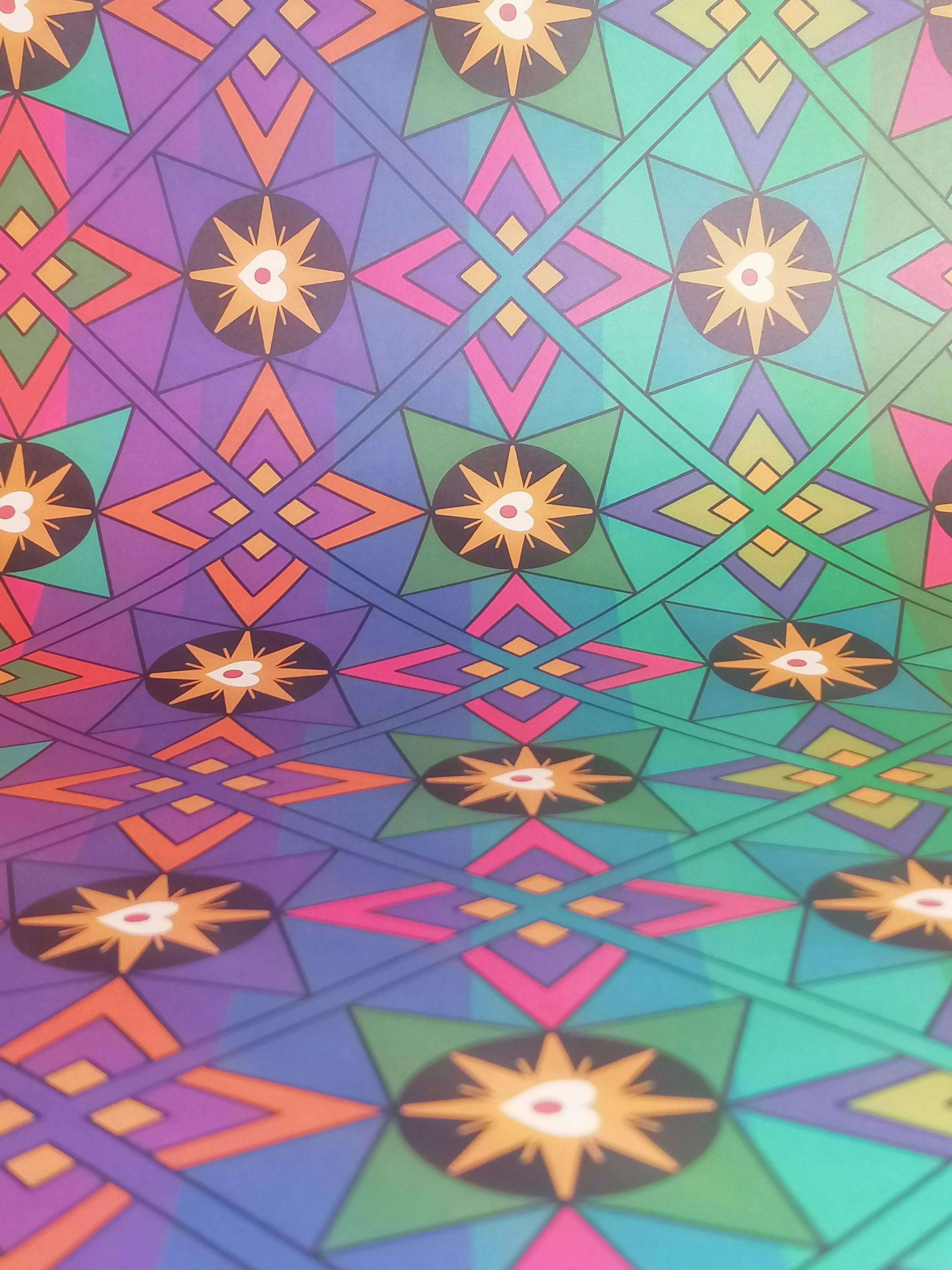 A photo of the previous print-run of the gift-wrap design, showing the vibrancy and quality of the print.