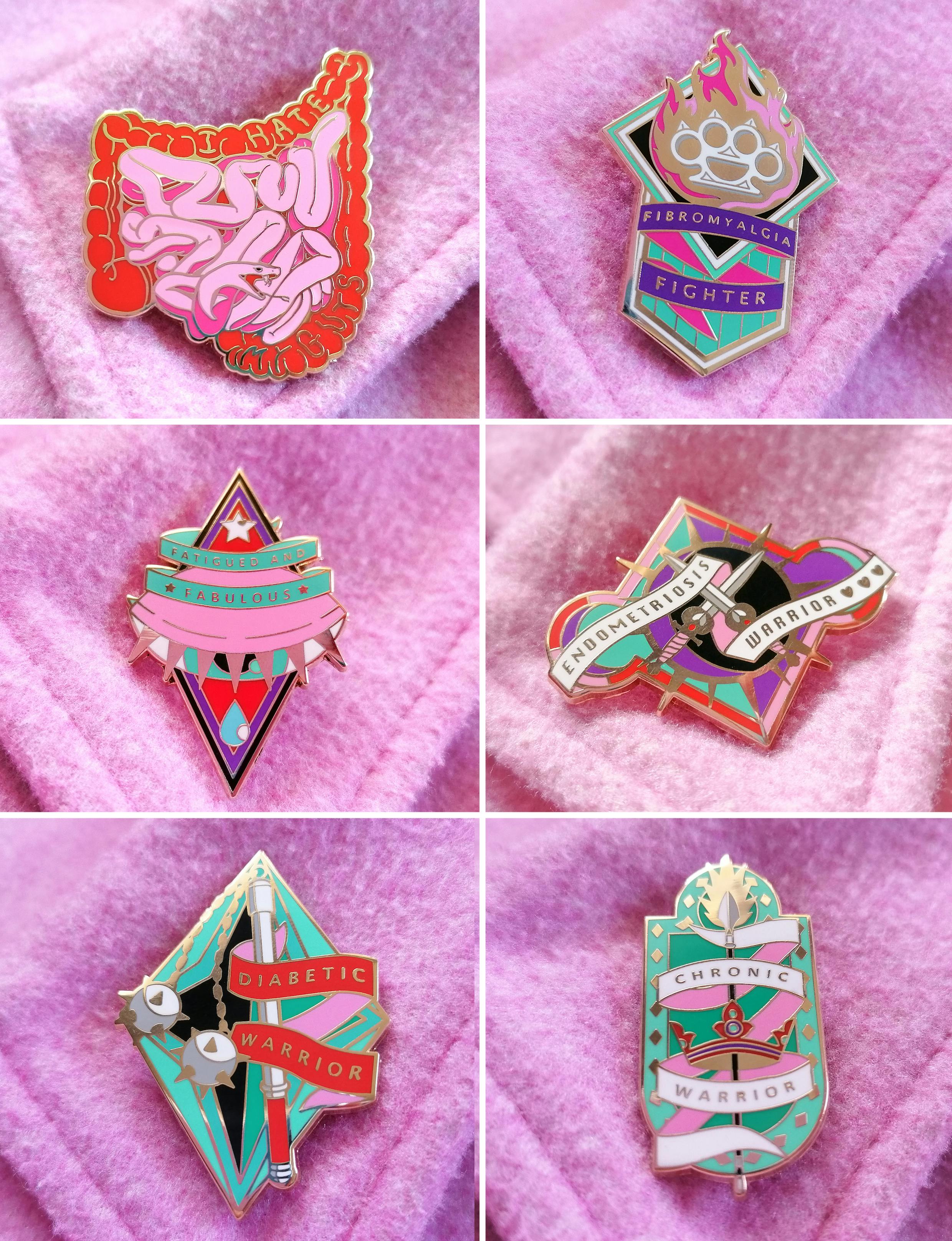 Chronic pins: I Hate My Guts, Fibromyalgia Fighter, Fatigued and Fabulous, Endometriosis Warrior, Diabetic Warrior, and Chronic Warrior.