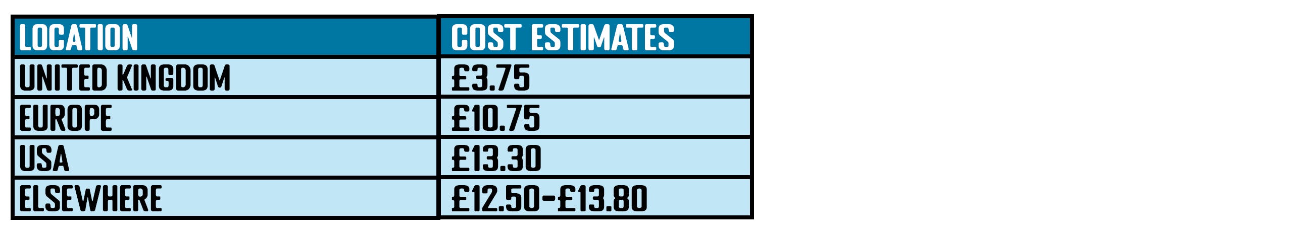 These prices are estimatesbased on current price lists and the weight of 1 to 6 pins. Actual shipping will be charged during surveys at the end of the campaign but I have done my best to estimate the post and packaging costs and Backerkit fees.