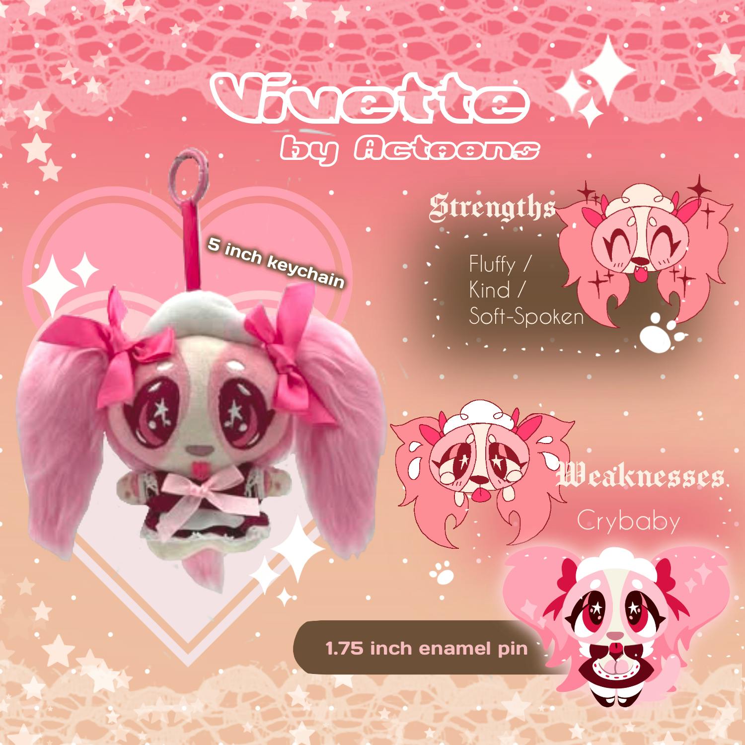 Matching Mimette, Vivi appears to you *also* in the form of a five inch keychain plush as well as a painted enamel pin!