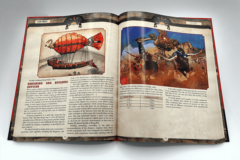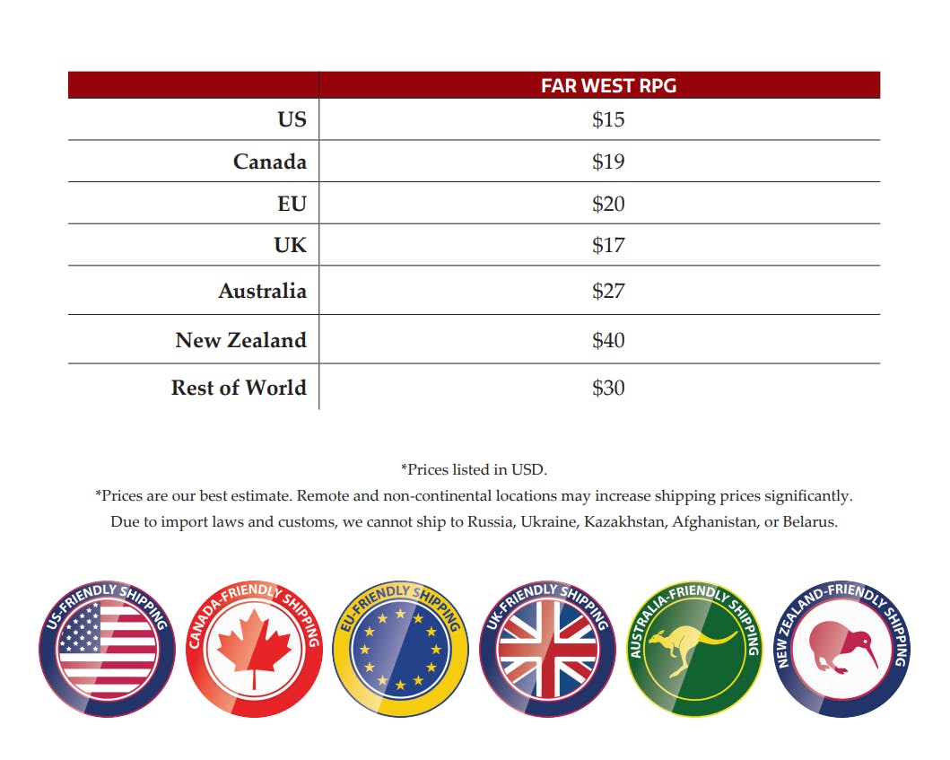 The Far West RPG is a 276-page hardcover book containing rules for creating heroes and running adventures in a unique setting combining steampunk, Chinese Wuxia, and Spaghetti Western elements. Learn how to forge heroes wrought from iron and villains born of fire; track their legendary deeds and mighty exploits; take a pilgrimage on the dust road; and wield swords, sixguns, cog science, and secret scrolls of kung fu!