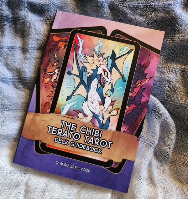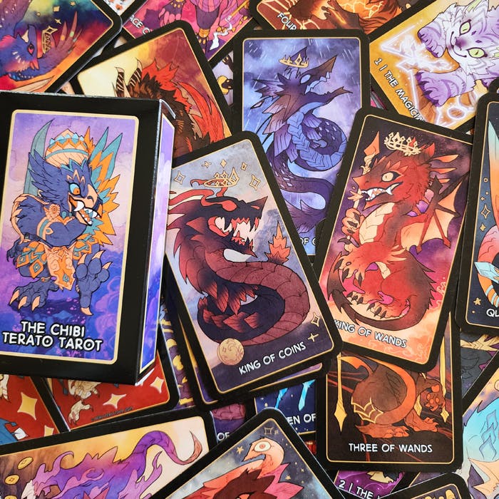 ✧ The Chibi Terato Tarot Deck with 78 cards featuring wondrous monsters, mythological creatures, and a colorful yet stylish aesthetic, now with a newly written 100+ page Guidebook and newly created Deck Box!