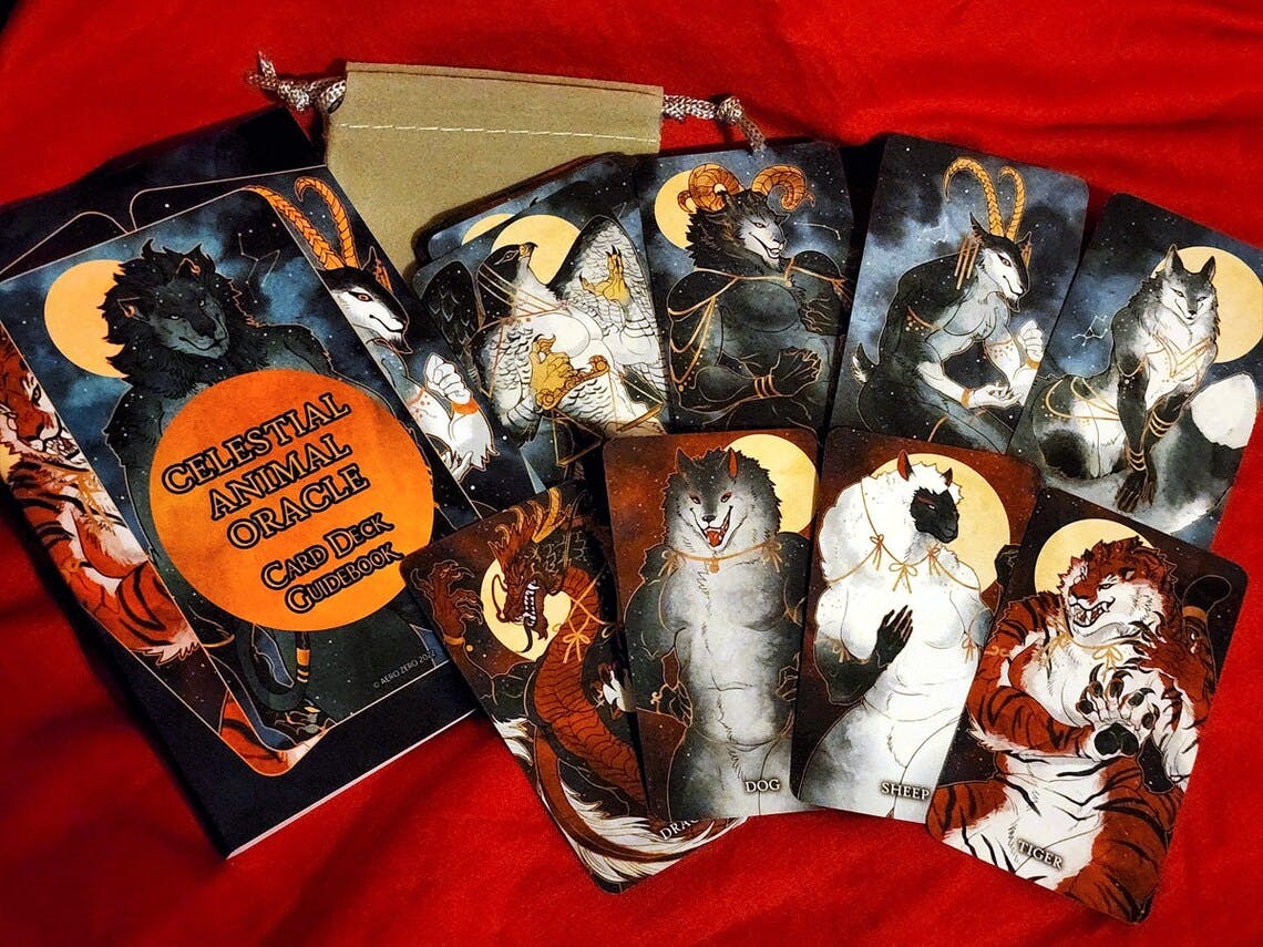 The Celestial Animal Oracle Deck + Bag + Guidebook (24 cards, 120+ page Guidebook, Grey vegan synthetic velvet bag)