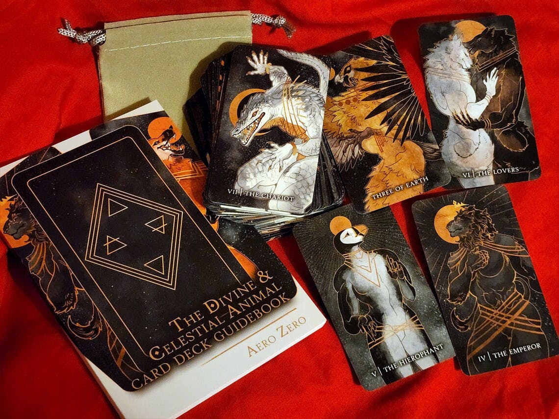 The Divine Animal Tarot Deck + Bag + Guidebook (78 cards, 100+ page Guidebook, Grey vegan synthetic velvet bag)
