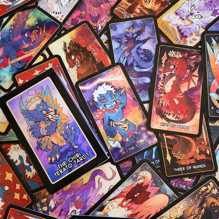 You can sign up to be notified when the project goes live on its teaser page here - Early Bird Backers of Chibi Terato Tarot 2nd Edition will get a newly made free set of stickers based on monsters from the deck! I'm very proud of the book and the updates to the project, and I hope you're excited to dive into readings with some cute monsters and cryptids at your side :)