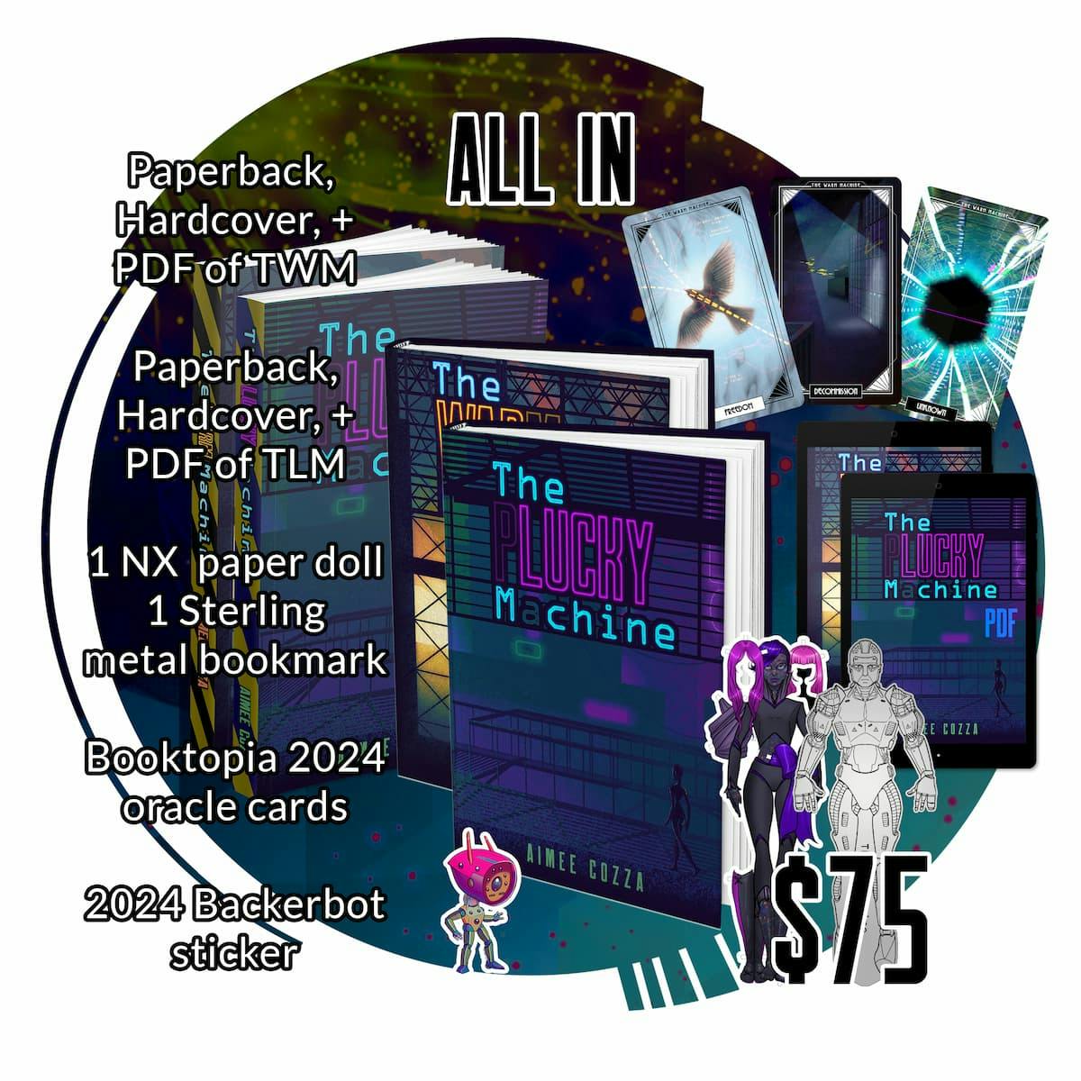 (Almost) Everything I've got. The Warm Machine on hardcover, paperback, and ebook. The Lucky Machine on hardcover, paperback, and ebook. NX paper doll. Sterling metal bookmark. 3 oracle cards from the Booktopia 2024 oracle card deck. Backerbot sticker from the 2024 campaign. Plus anything else unlocked along the way! Limited quantity.