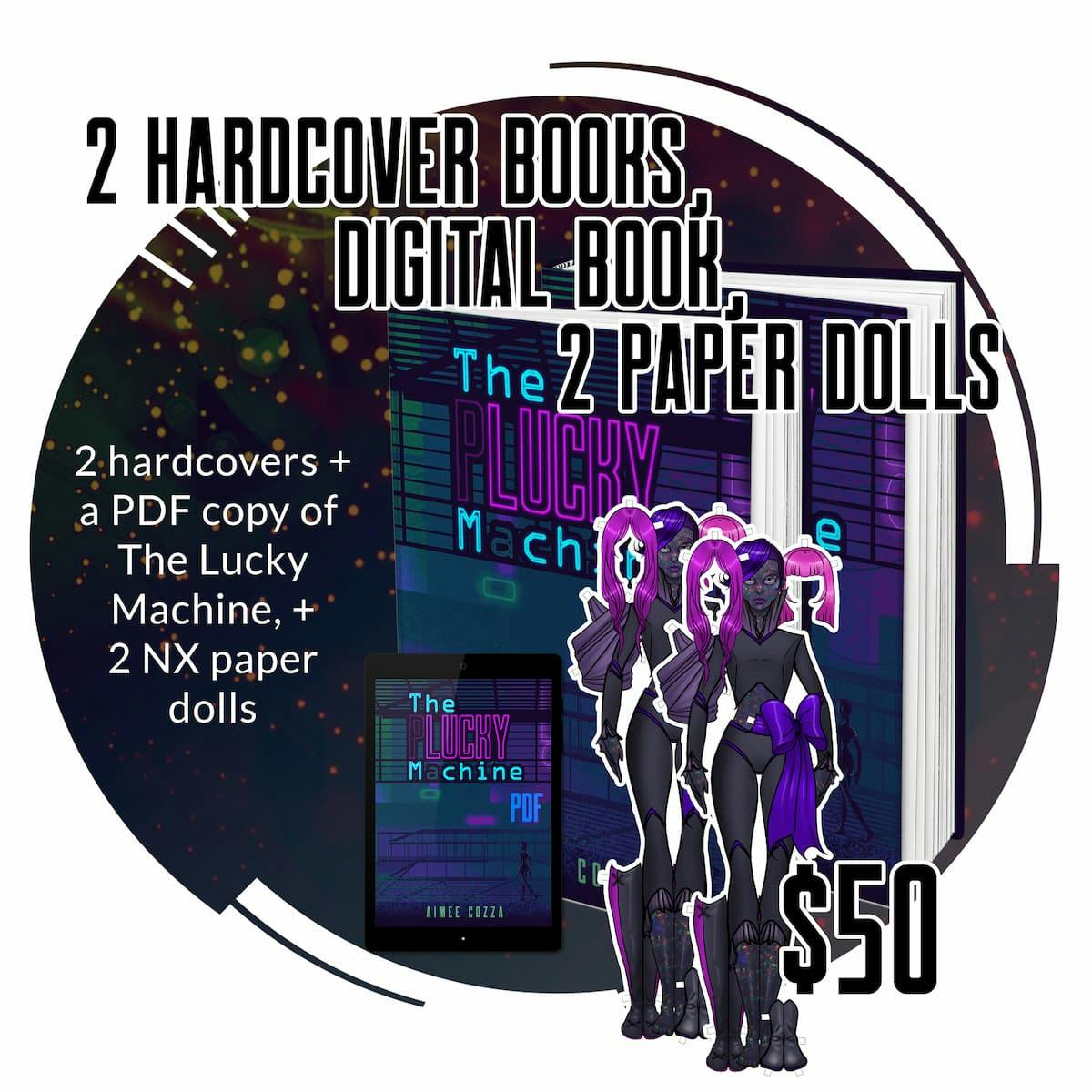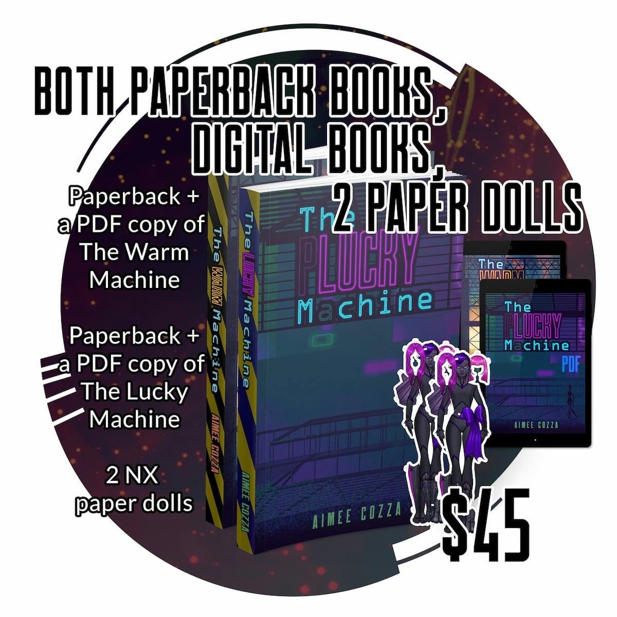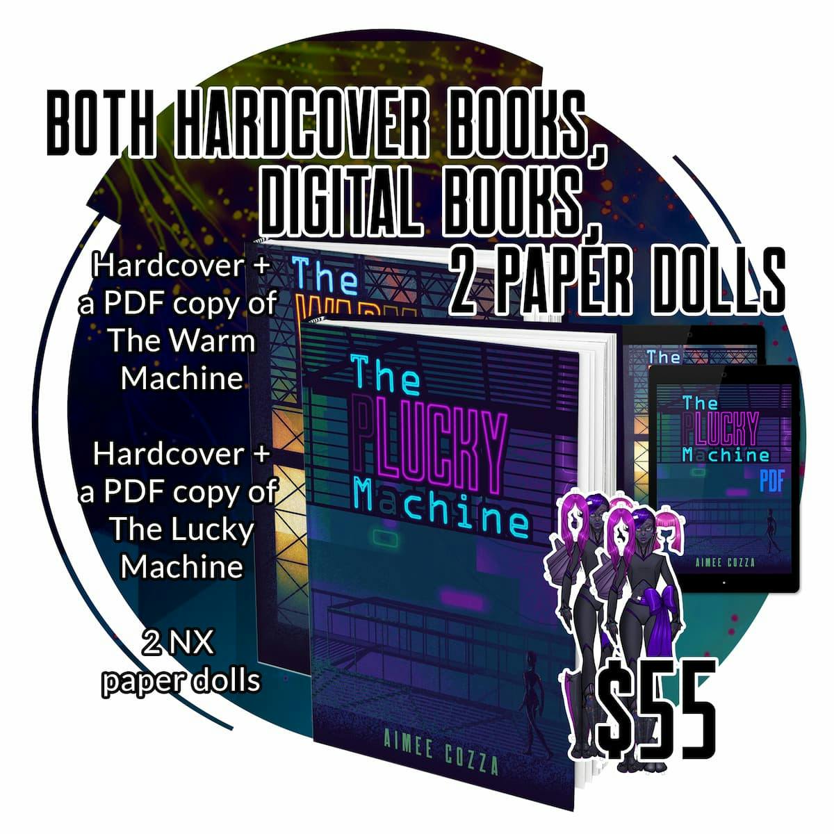 Receive a physical hardcover copy of The Lucky Machine and a physical hardcover copy of The Warm Machine, as well as digital PDF and epub copies of both. Approximately 190 pages, 5.5”x8.5” paperback size, cream colored black-and-white interior with full color covers. Enjoy supplemental illustrations printed inside each book, and short story “GTY4355 Quick Start Guide”. Comes with two specialty NX paper dolls, which double as a bookmarks!