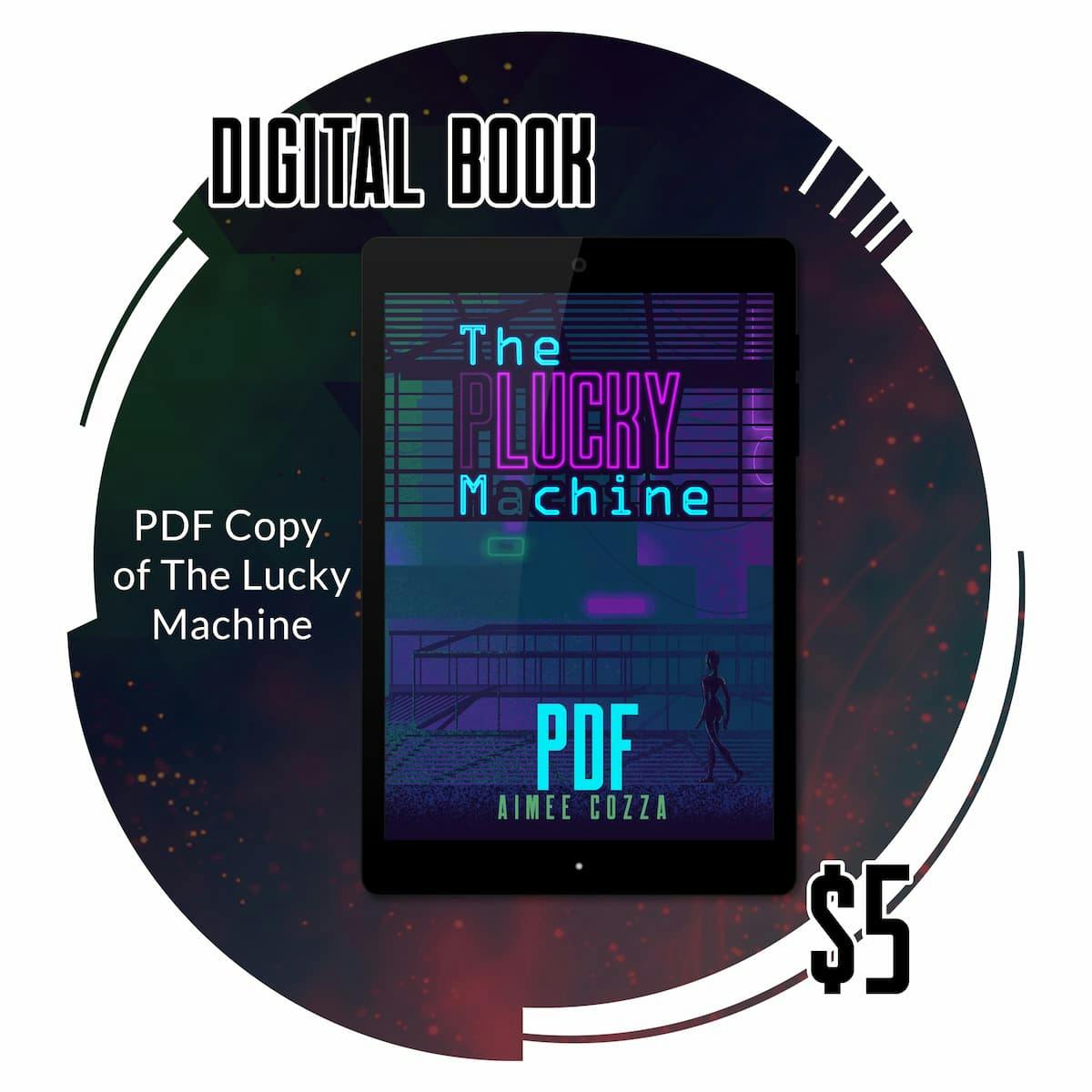 Receive a physical paperback copy of The Lucky Machine and a digital copy via PDF and epub. Approximately 190 pages, 5.5”x8.5” paperback size, cream colored black-and-white interior with full color covers. Enjoy supplemental illustrations printed inside the book, and short story “GTY4355 Quick Start Guide”