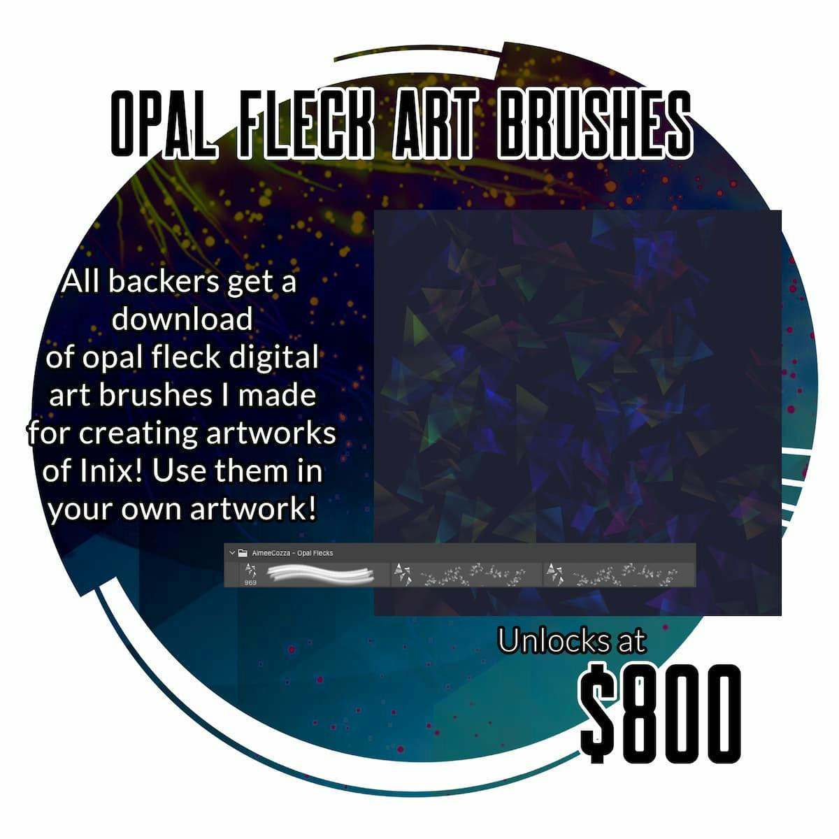 If we reach a funding goal of $800 (2x), I will include as a digital reward a digital brush you can use in Photoshop, Clip Studio Paint, or anywhere that supports .abr files to make the opal fleck look of Inix's silicone skin!