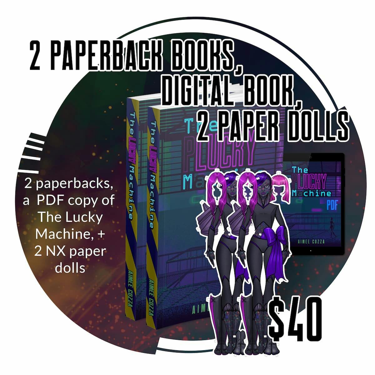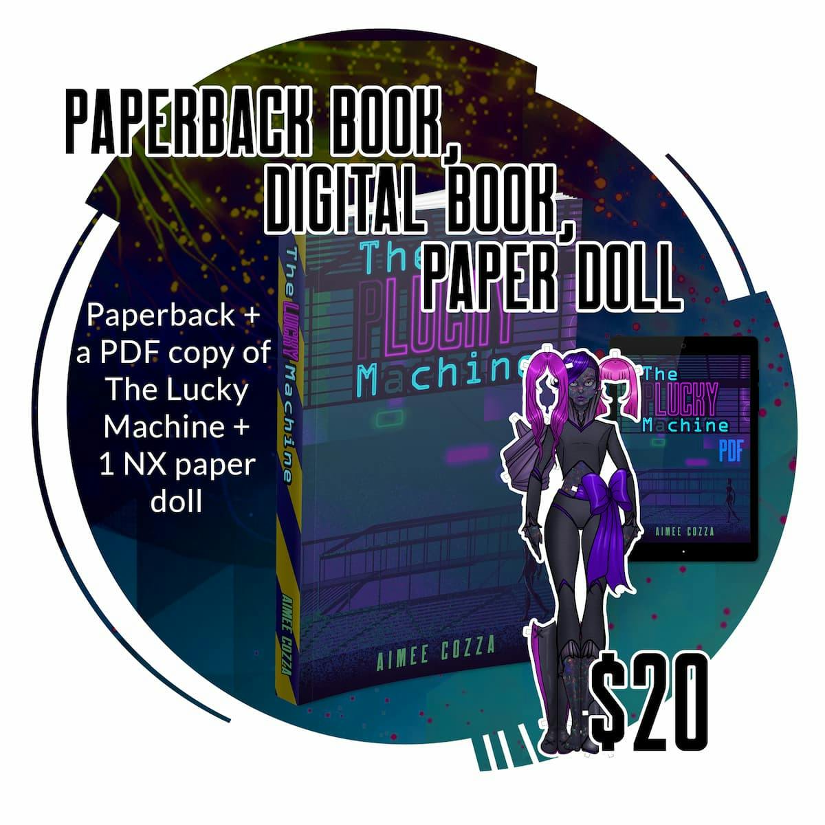 Receive 2 physical paperback copies of The Lucky Machine and a digital copy via PDF and epub. Approximately 190 pages, 5.5”x8.5” paperback size, cream colored black-and-white interior with full color covers. Enjoy supplemental illustrations printed inside the book, and short story “GTY4355 Quick Start Guide”. Comes with two specialty NX paper dolls, which double as a bookmarks!