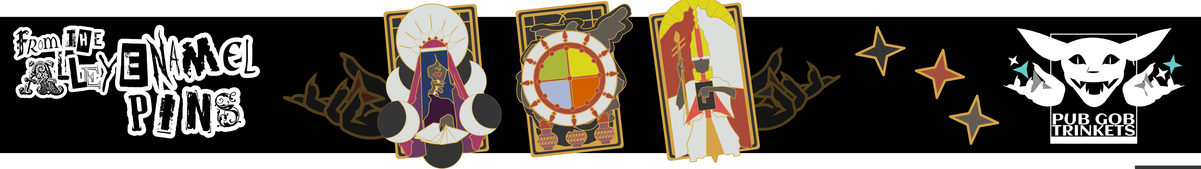 It's Pintopia, and you know what that means! I'm partnering with Seven of Pub Gob Trinkets, who's making a gorgeous set of stained glass tarot cards. If you back both of our projects at a physical pledge tier, you'll unlock a very special set of small tarot card pins... 4 pins in all! You'll get two gold and two silver hard enamel pins no larger than .75" in height. How cool is that?!