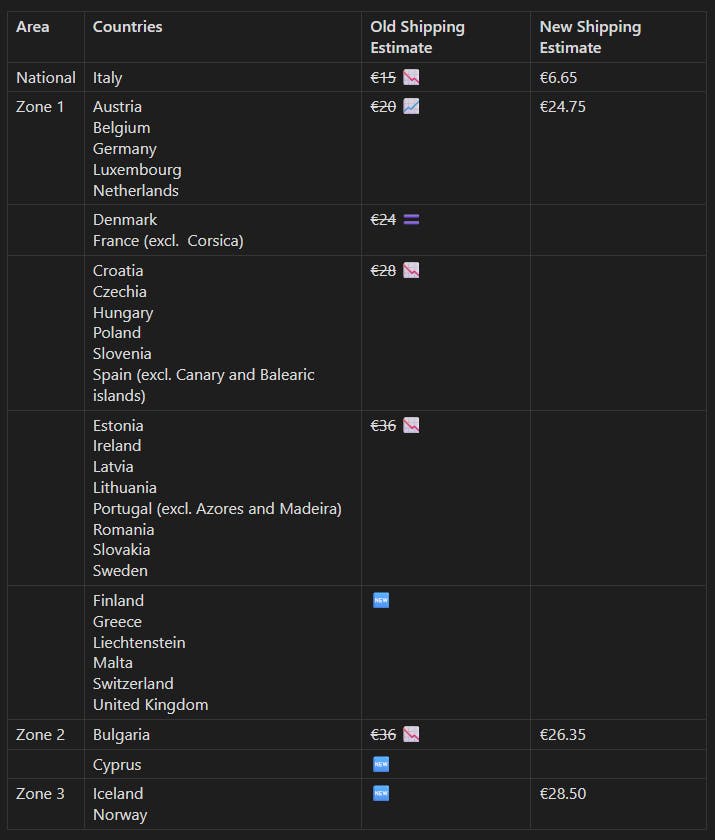- On average, you can expect cheaper shipping across the board. Where that isn't the case, we'll regrettably stick with Poste Italiane anyway given the uncertainty surrounding GLS' pricing. Regarding Swiss and British backers, as far as I can tell they won't be charged customs. I really hope that's the case and apologize in advance if the opposite may prove true.