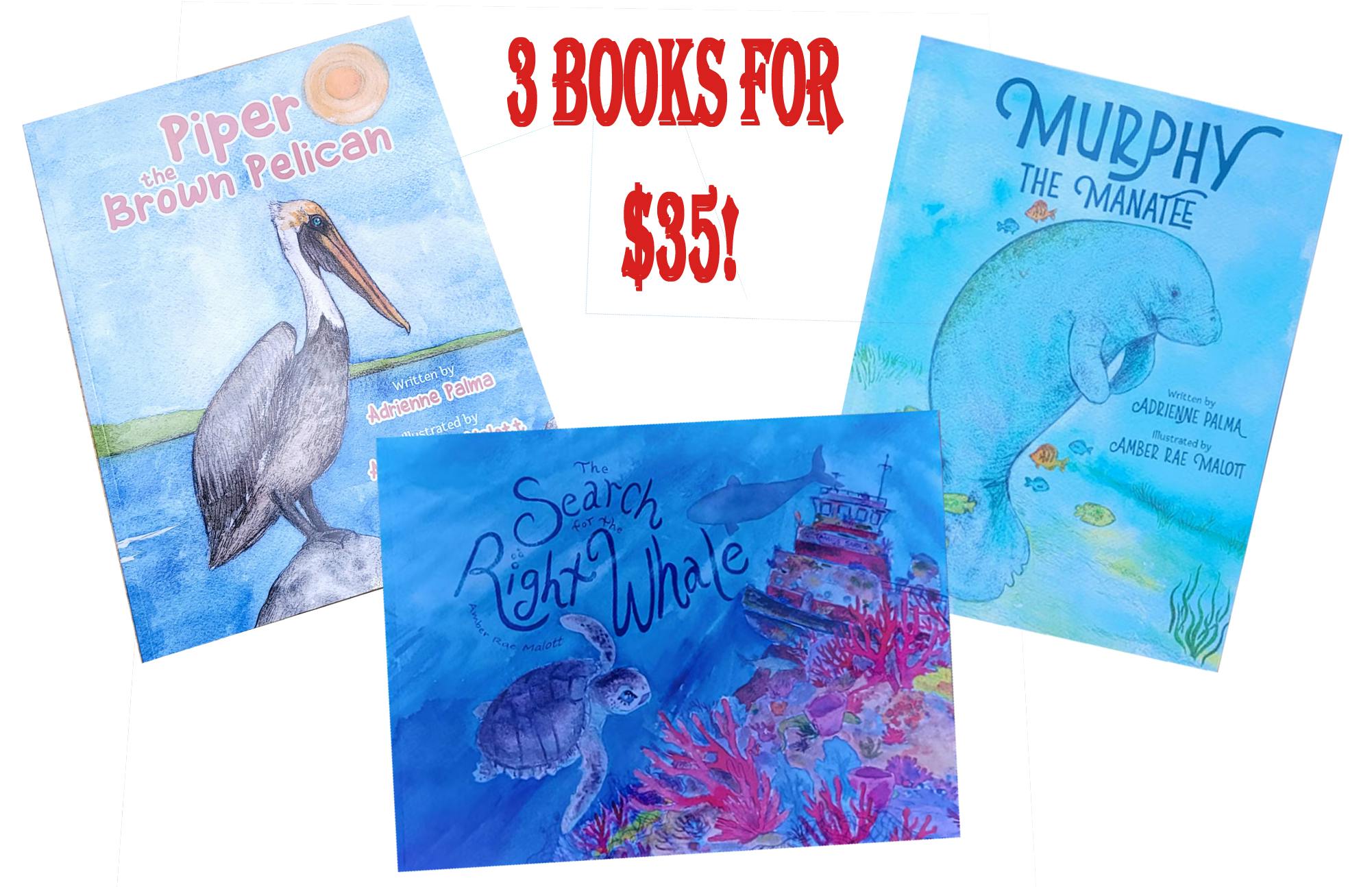 Get all 3 paperback books for only $45 $35 Get The Search for the Right Whale, Piper the Brown Pelican and Murphy the Manatee! All come with an ink drawing of the main character in the cover!