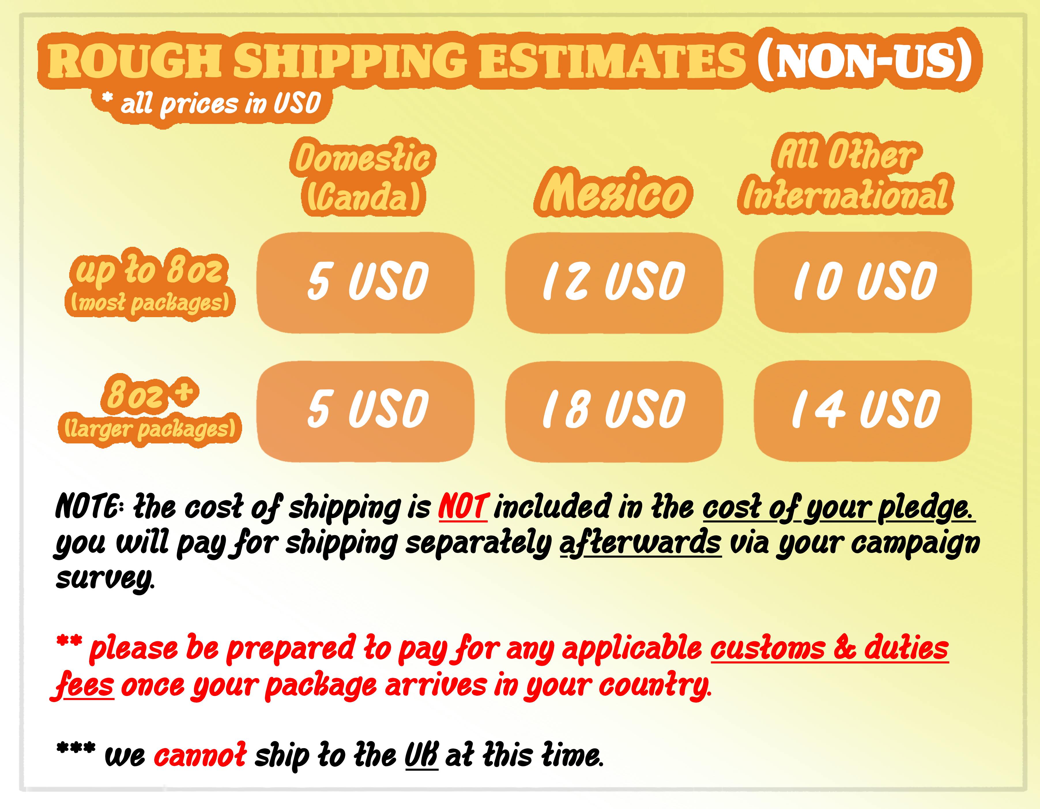 relations with the US are currently strained & may change at any time with little warning. this may affect shipping fees in unexpected ways, so please keep this in mind when pledging to the project from the US!