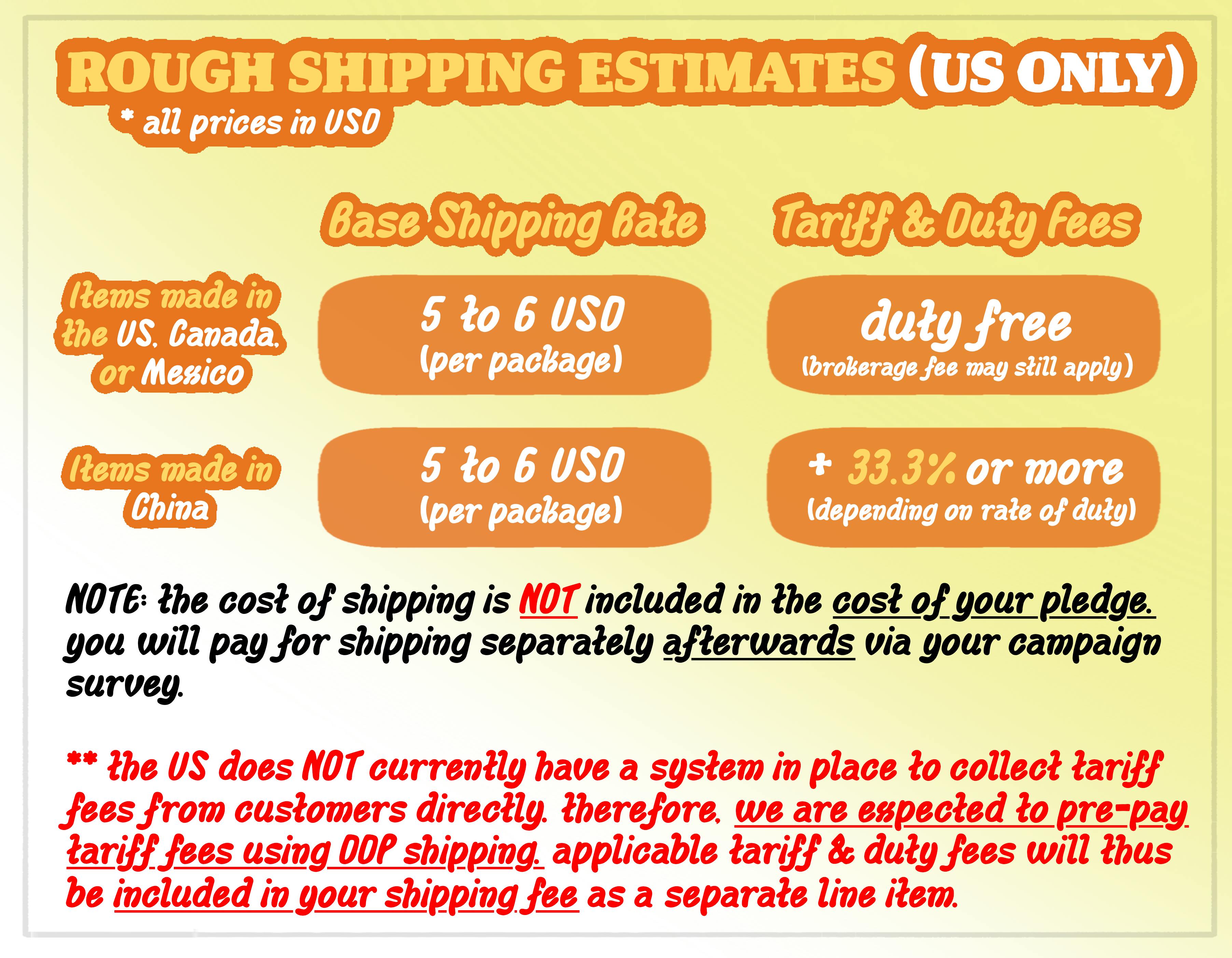 (ex. you pledge for a 3 pin tier that costs $45 USD, which is discounted from the regular cost of three pins ($51). you will pay tariff fees on the total value of the pins ($51), even though you only paid $45. the tariff fee for pins is roughly 33.3%, so at checkout, you will be expected to pay an approximate $17 USD tariff fee (not including brokerage or shipping fees).)