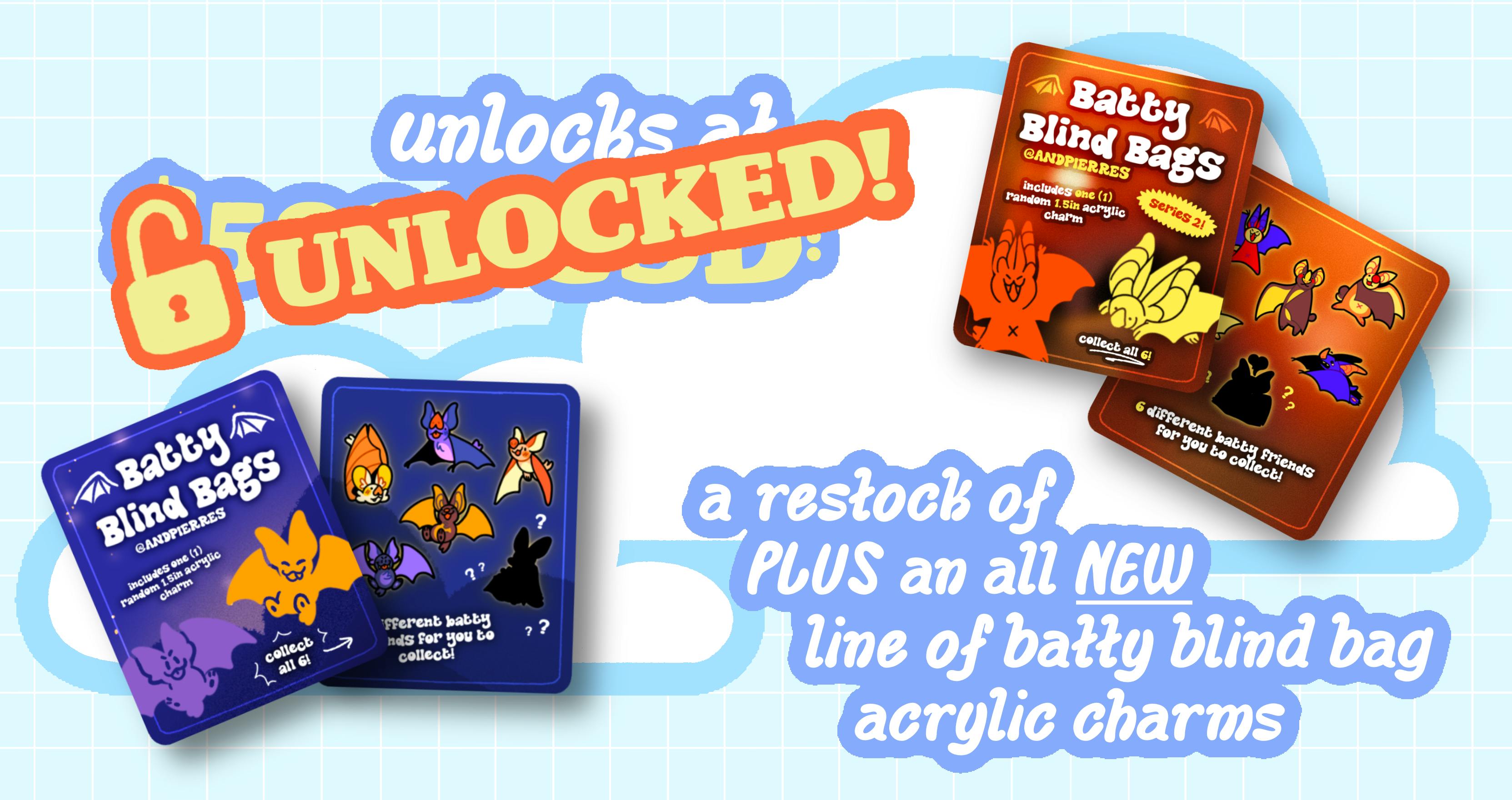 our next reward, unlockable at $5,000 USD, is a restock of my popular batty blind bags, which were available as an add-on during the initial batpack campaign!