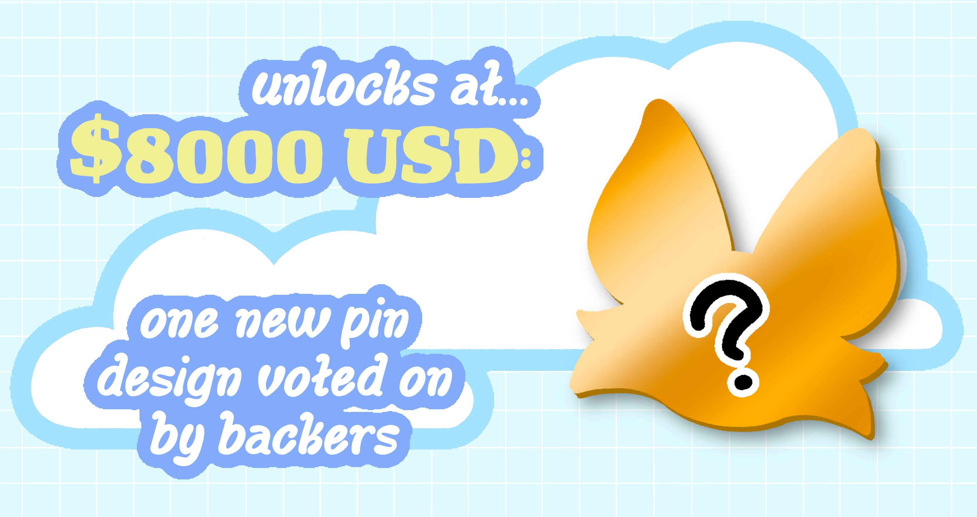 at $6,000, $7,000, and $8,000USD, additional pin designs of your choice will be unlocked! designs will be pitched as polls during the campaign/pre-campaign process, and backers/supporters will be able to choose which ones they want to unlock first.