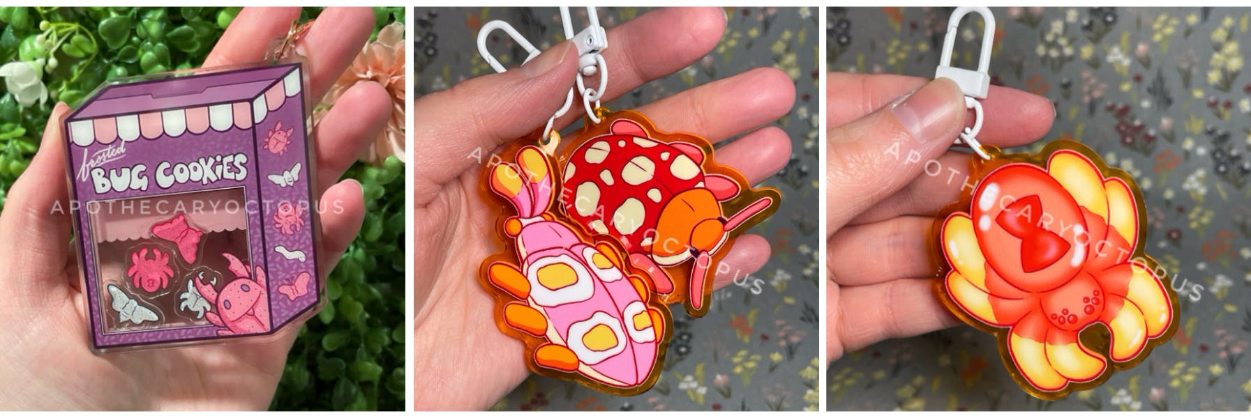 By popular request, I'm also adding a keychain add-on tier! There will be two versions, one for the Frosted Bug Cookies shaker keychain (which has already been made, but I want to order more so this will gauge how popular they are!) and a regular acrylic keychain tier featuring designs from my previous food collection, Candy Bugs.
