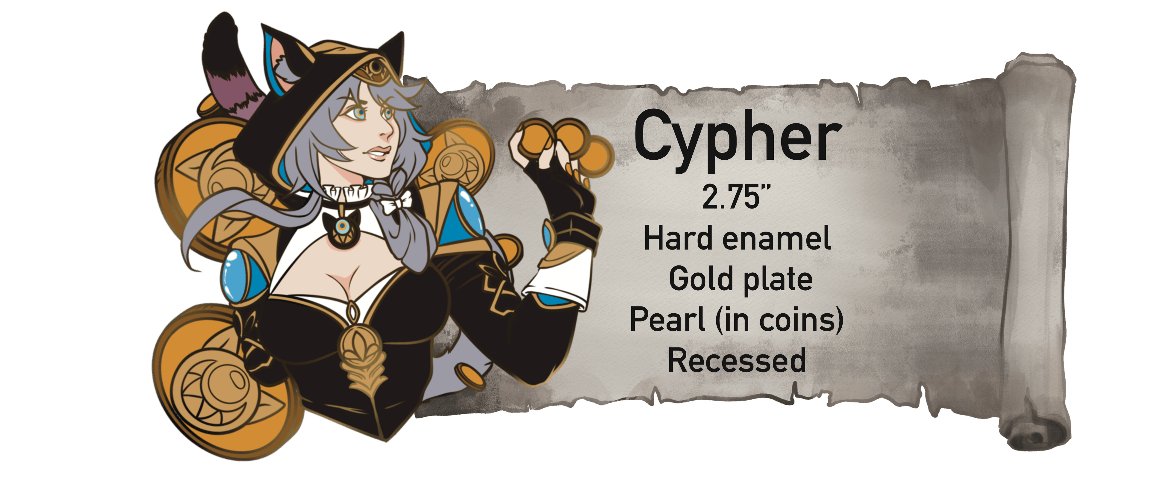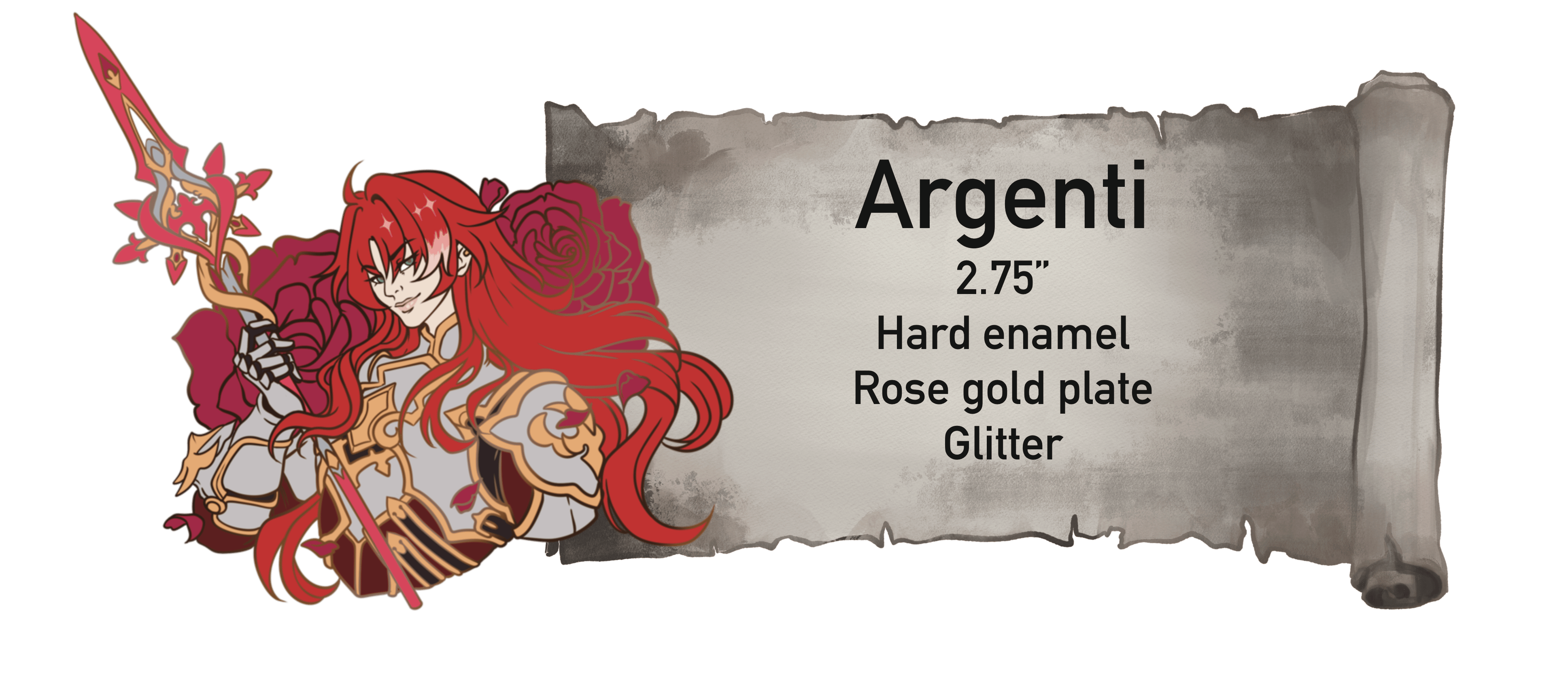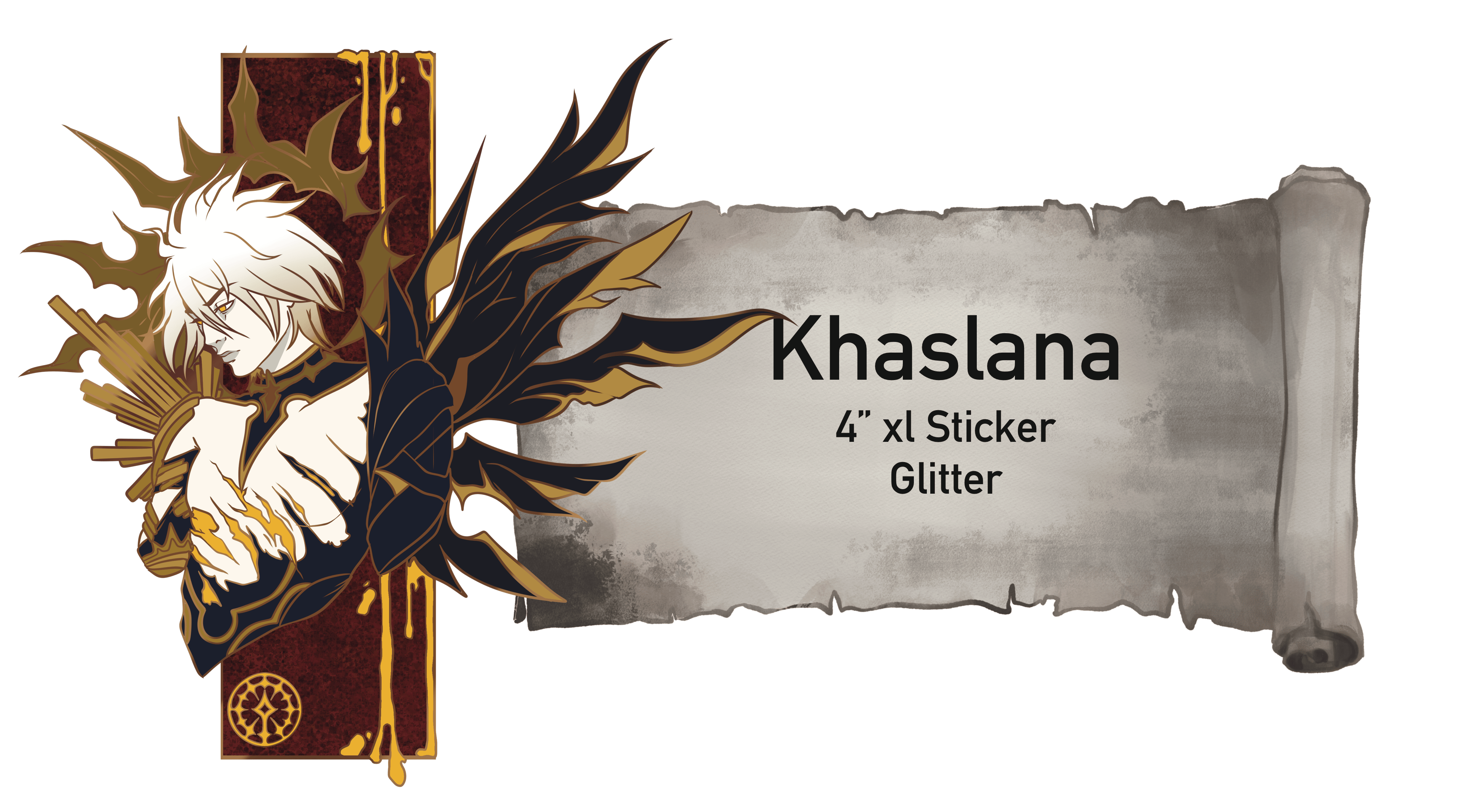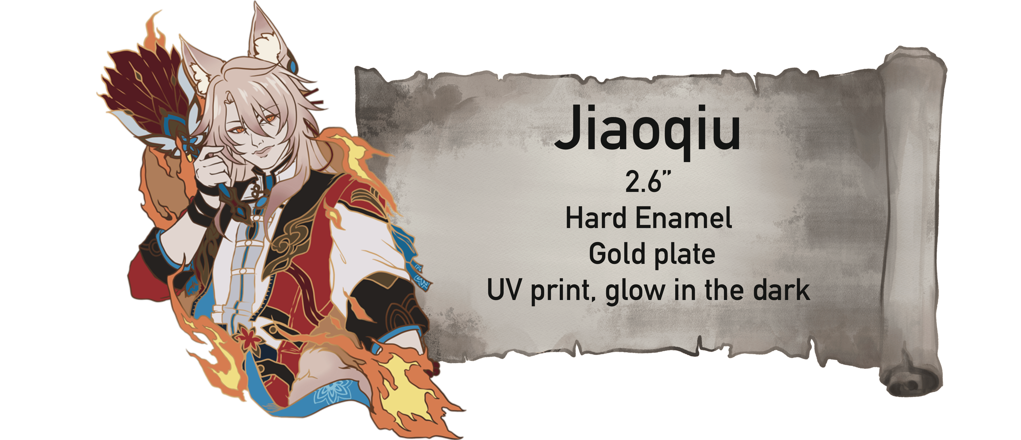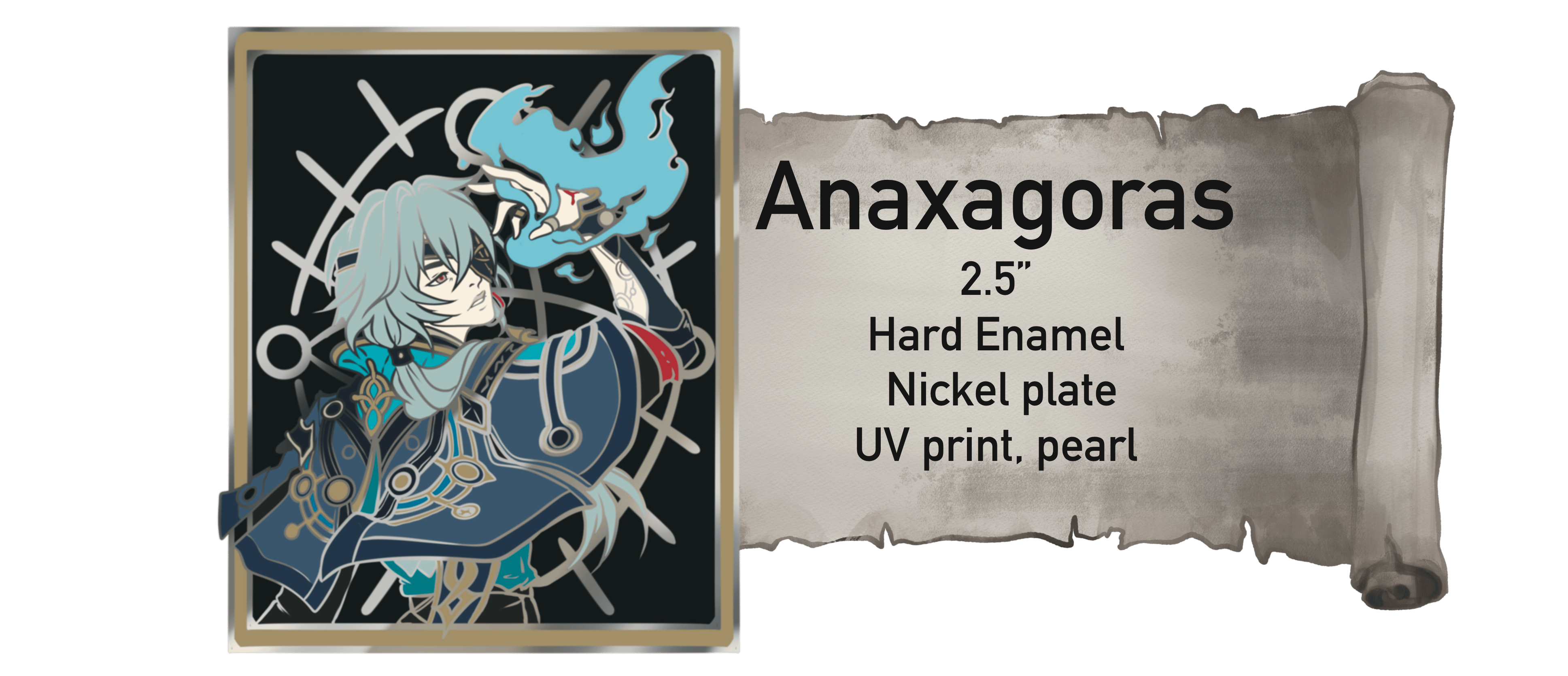 Each pin will have unique features such as drastic cut outs, multiple extra additions for example, the first unlockable pin is Khaslana. He is a large 3 inch pin. He will have a beautiful, shiny gold plating. The rectangle behind him will be a deep blood, red glitter, and all of the brightest yellow yellows across the pin will be glow in the dark..