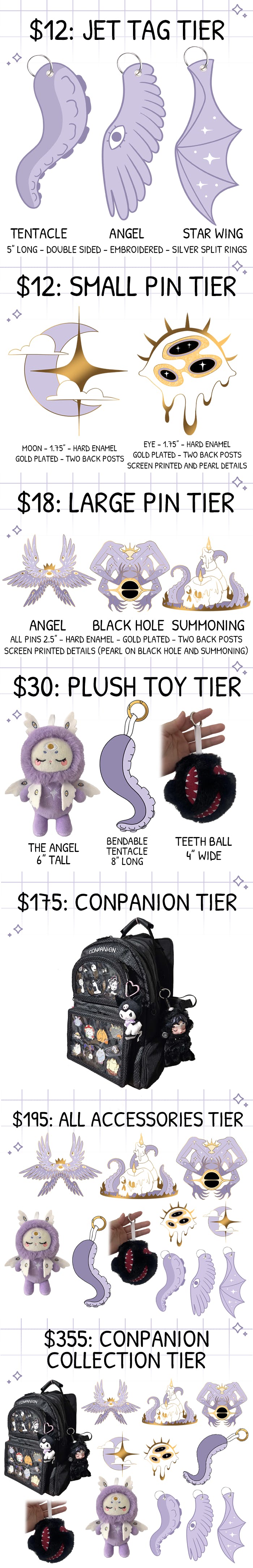 Please take a look at the rewards of this project! [Jet Tag Tier]: $12 - one jet tag of your choice ($15 retail value) [Small Pin Tier]: $12 - one small pin of your choice ($15 retail value) [Large Pin Tier]: $18 - one large pin of your choice ($20 retail value) [Plush Toy Tier]: $30- one plush toy of your choice (a $35 retail value) [All Accessories Tier]: $195 - one of every pin, jet tag and plush toy ($240 retail value) [CONPANION Tier]: $175 - one backpack ($185 retail value) [CONPANION Collection Tier]: $355 - one backpack and every accessory ($425 retail value)
