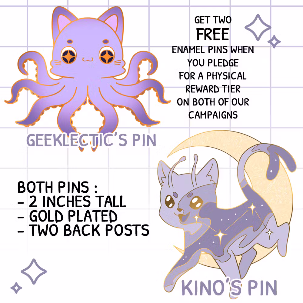 During this campaign I'm collaborating with Geeklectic and their Nekonomicon project! When you pledge for a physical reward from both of our campaigns, you get not one, but TWO FREE enamel pins! Check out the designs!