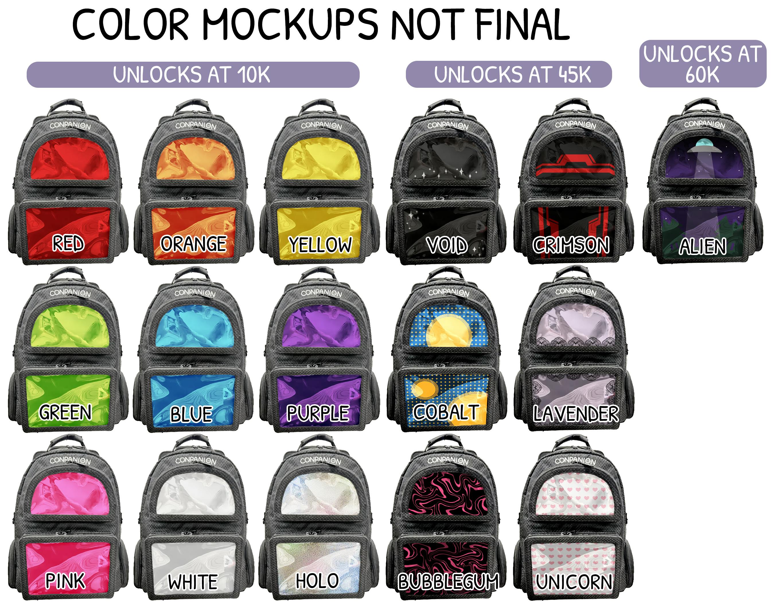 [$1000 GOAL]: All enamel pins and jet tags [$4000 GOAL]: The Plush Toys [$8000 GOAL]: The CONPANION [$10,000 GOAL]: All new insert colors [$18,000 GOAL]: Two new CONPANION colorways (cobalt and bubblegum) [$25,000 GOAL]: Two new CONPANION colorways (crimson and lavender) [$32,000 GOAL]: Final CONPANION colorway (unicorn) [$40,000 GOAL]: FREE enamel pin for every physical tier backer [$45,000 GOAL]: Additional themed inserts with every bag [$60,000 GOAL]: Surprise CONPANION colorway (alien) [$65,000 GOAL]: Every CONPANION gets a FREE reusable folding bag