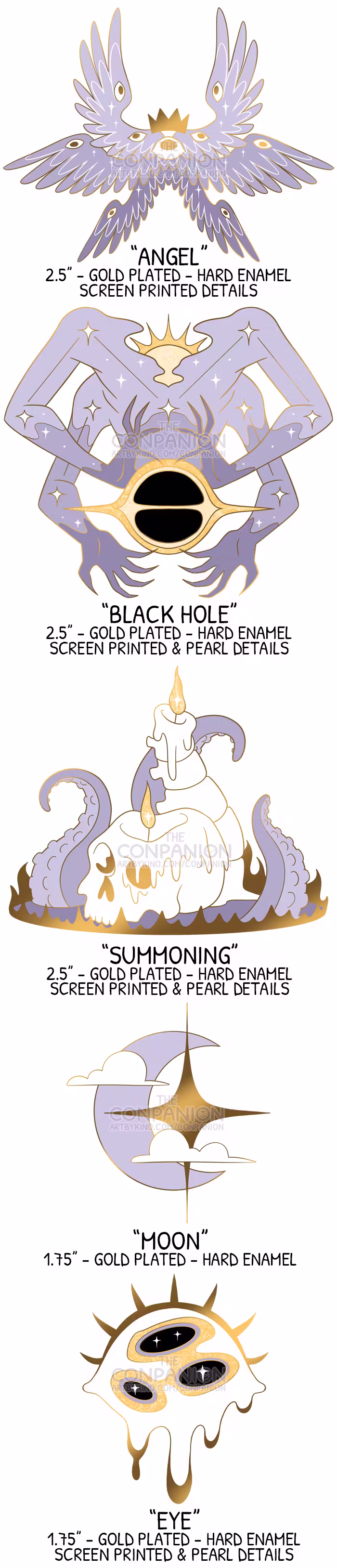 I wanted to design some super cool celestial horror pins as companion pieces to the backpack. Please take a look at their designs!
