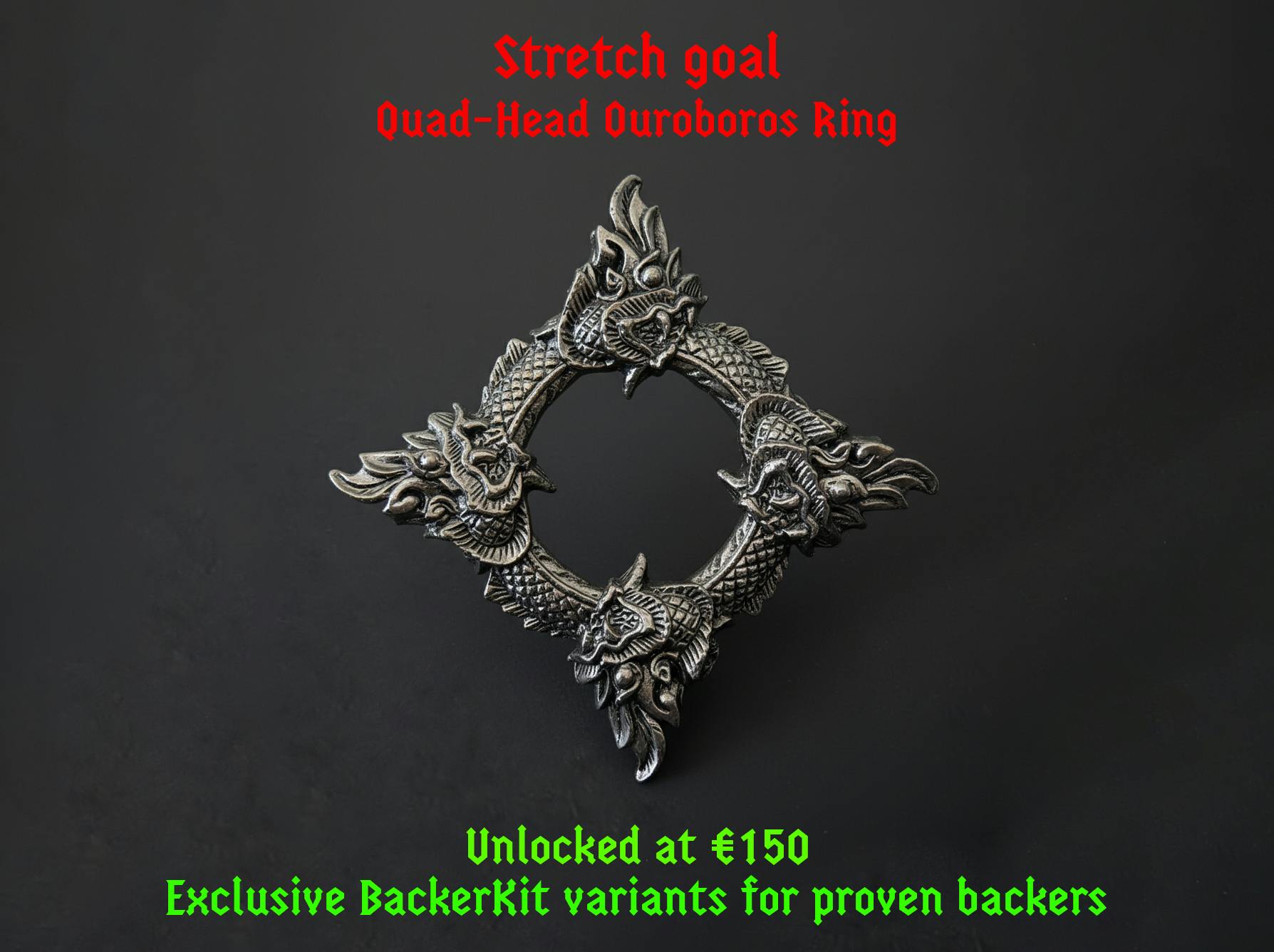 Stretch Goal Details: Quad-Head Ouroboros Ring - exclusive BackerKit variants for proven backers When we hit €150, this epic variant unlocks as an add-on option for all backers, priced exactly the same as the original Ouroboros Ring. Available to every pledge level (no matter your base ring choice). Must add this as add-on in pledge manager.