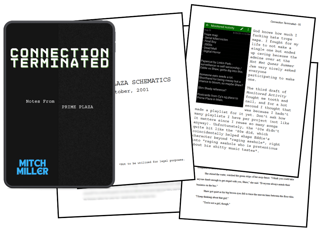 "Connection Terminated: The Making Of" — A PDF featuring early outlines, author notations, commentary, unhinged notes app screenshots, sketches, the original Monitors short story, and other miscellanea from Monitored Activity's creation.