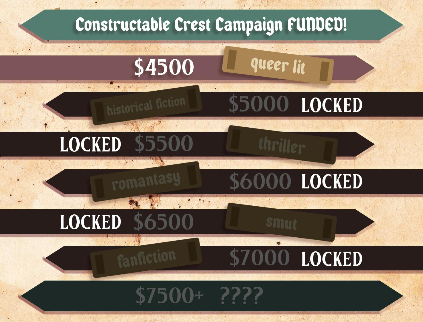 Stretch Goals: he first of our stretch goals was funded overnight!! This means the "Queer Lit" banner bar will be available in your reward and add-on choices! Next up, we've got "Historical Fiction" at $5000, and "Thriller" at $5500. Can we meet those within this first week?? (I, personally, am pulling for the "Fanfiction" bar at $7000 myself, but that's because I'm a goblin with specific tastes :D)