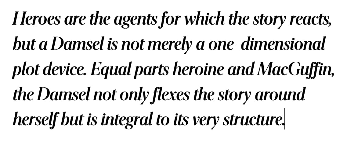 To me, a Damsel is more then a helpless princess in a dungeon. They are a character that excels at driving that drive plot through driving the other characters. They may seem helpless, or even actually be helpless, but that doesn't have to mean a lack of agency. I quoted some of my favorite damsels (as I see them) that have embody this in pop culture. I think I am better at defining this particular archetype this way, then through my own words.