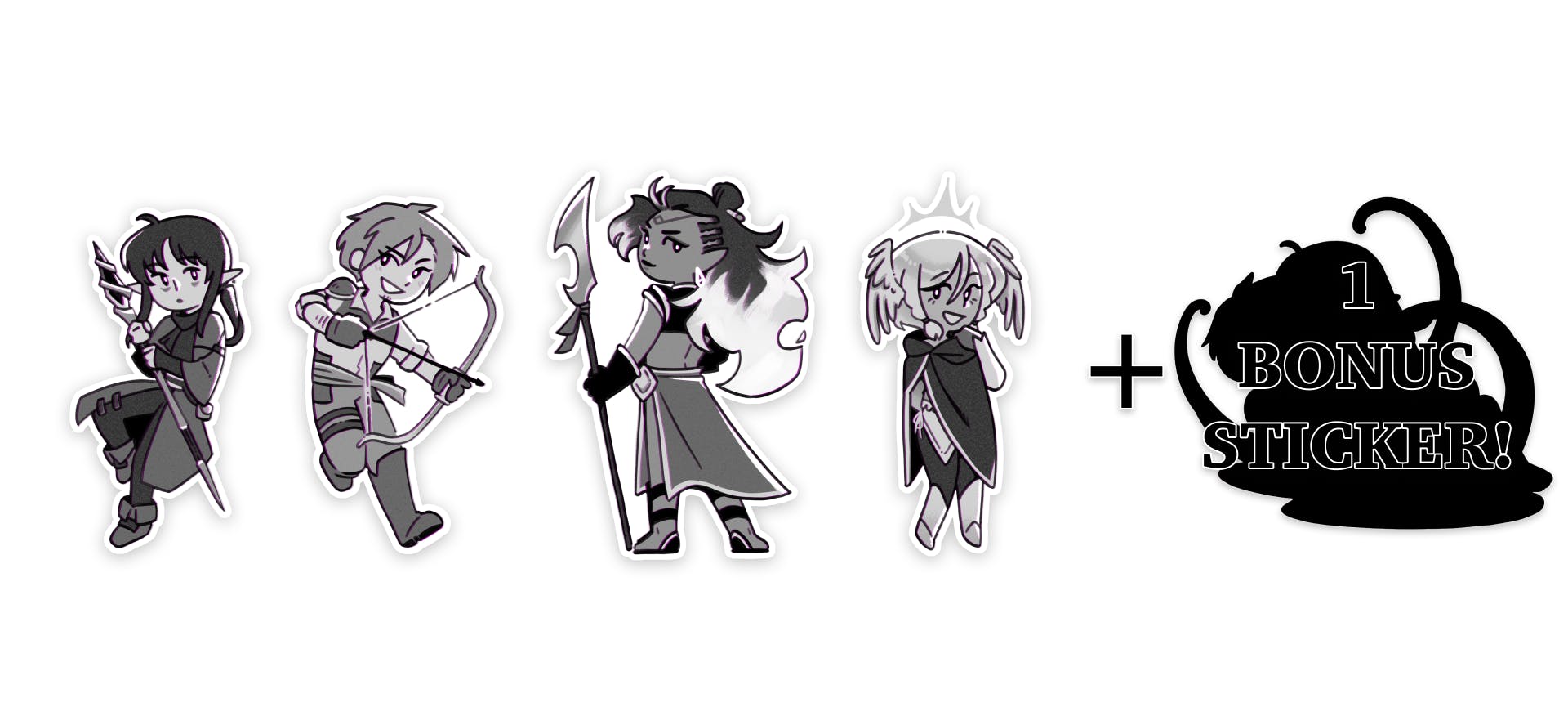 Our party's adventure continues wherever you stick them! These chibi-style die cut stickers are approx. 4" x 2" and printed on chromatic sticker paper. Get the whole party, and a bonus sticker will be included!