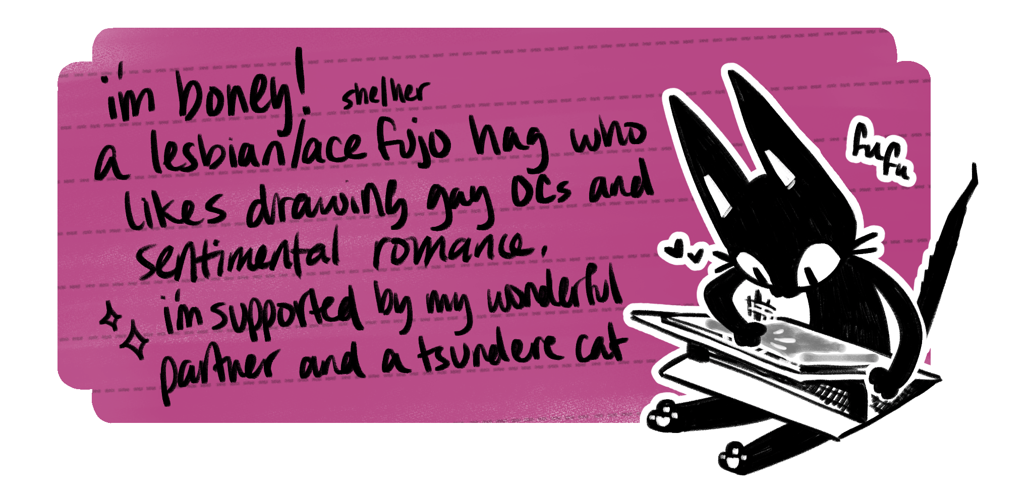 image reads: i'm boney! she/her. a lesbian/ace fujo hag who likes drawing gay OCs and sentimental romance. i'm supported by my wonderful partner and a tsundere cat.