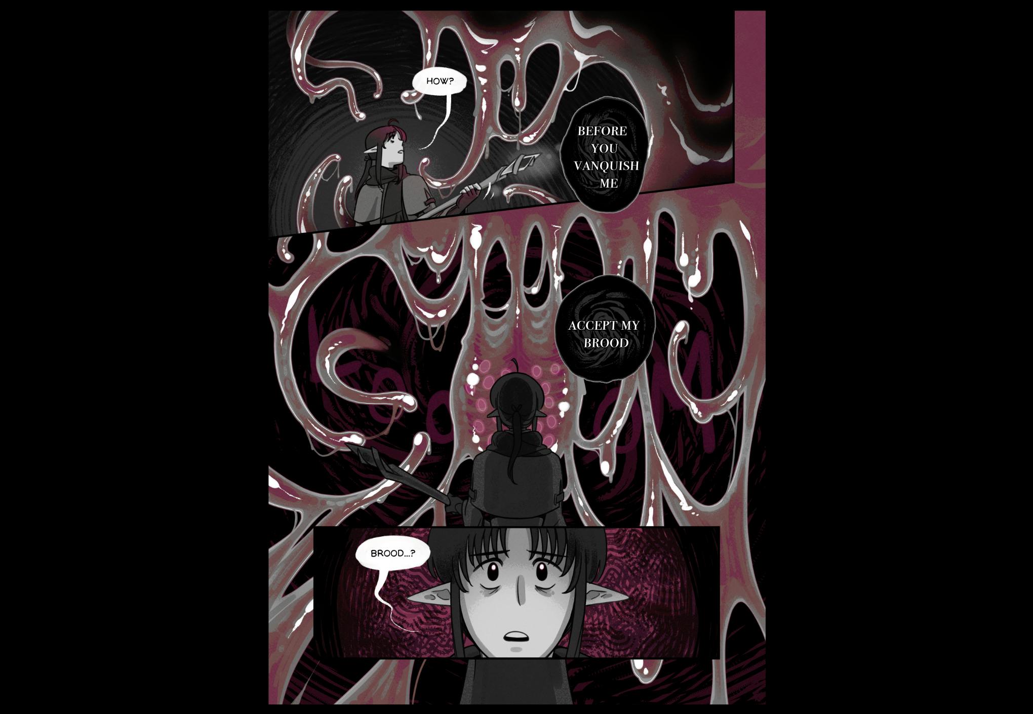 BROOD is a completed webcomic that ran between July 2024 and November 2025. While the original run was 118 pages, 7 bonus pages have been added for the print and PDF edition!